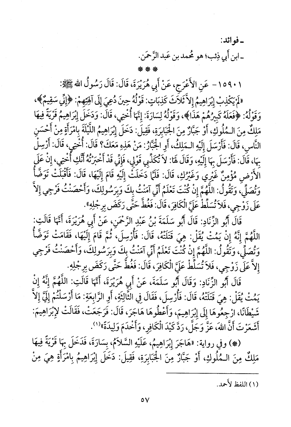 قال أَبو الزناد: وقال أَبو سلمة، عن أبي هريرة، أنها قالت: اللهم إنه إن يمت يقل: هي قتلته، قال: فأرسل، فقال في الثالثة، أو الرابعة: ما أرسلتم إلي إلا شيطانا، ارجعوها إلى إبراهيم، وأعطوها هاجر، قال: فرجعت، فقالت لإبراهيم: أشعرت أن الله، عز وجل، رد كيد الكافر، وأخدم وليدة» (¬١).