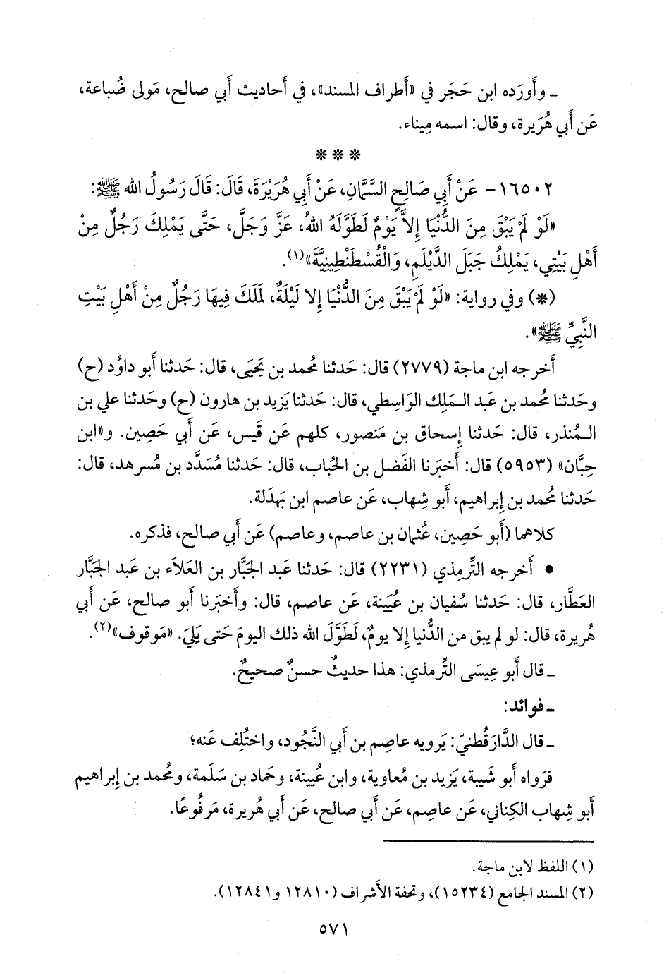 • أَخرجه التِّرمِذي (٢٢٣١) قال: حدثنا عبد الجبار بن العلاء بن عبد الجبار العطار، قال: حدثنا سفيان بن عُيينة، عن عاصم، قال: وأخبرنا أَبو صالح، عن أبي هريرة، قال: لو لم يبق من الدنيا إلا يوم، لطول الله ذلك اليوم حتى يلي. «موقوف» (¬٢).