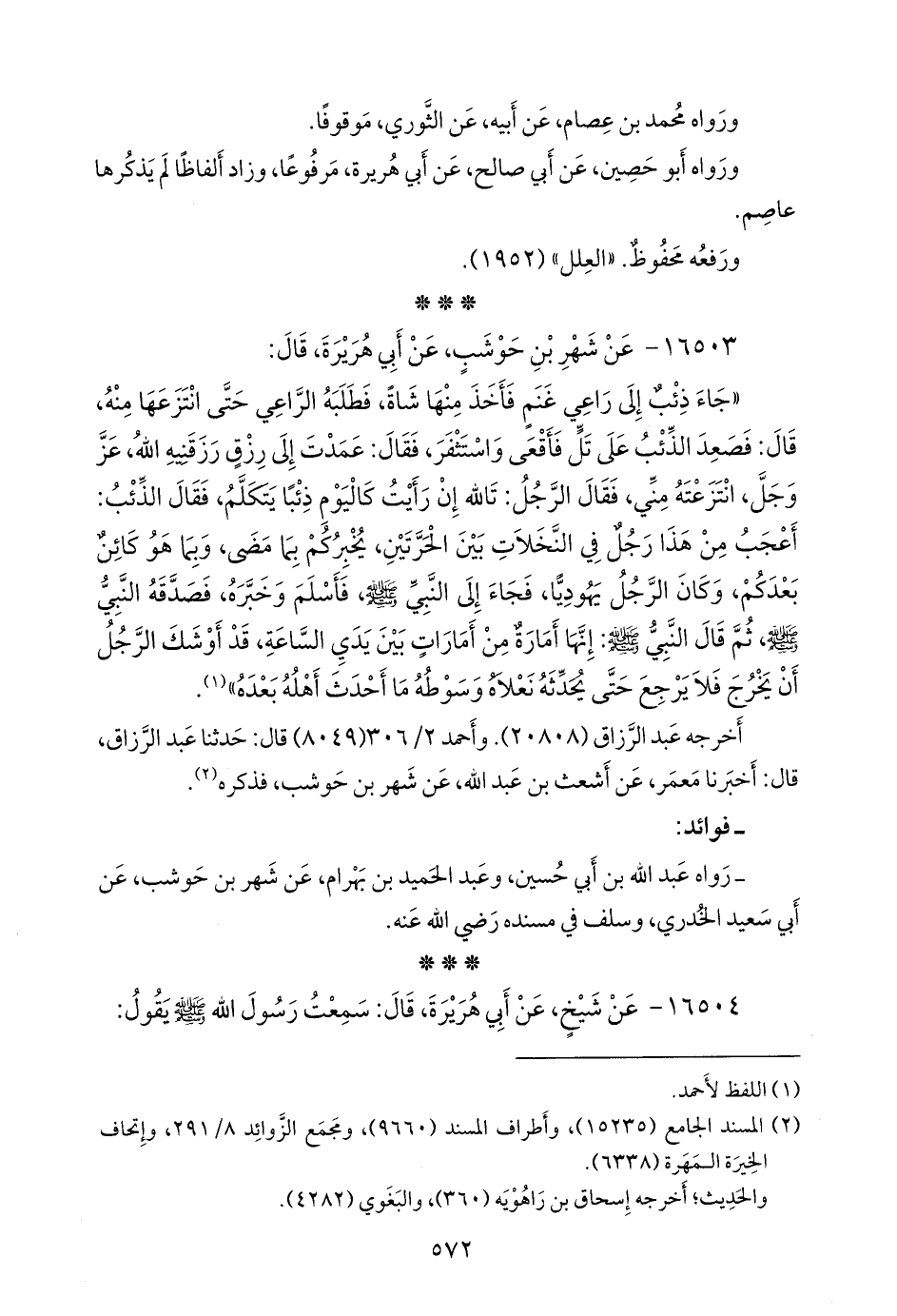 (¬٣) المسند الجامع (١٥٢٣٧)، وأطراف المسند (١٠٩٢٦)، والمقصد العَلي (١٨٣٠)، ومَجمَع الزوائد ٧/ ٢٨٧، وإتحاف الخِيرَة المَهَرة (٧٤٢٣).