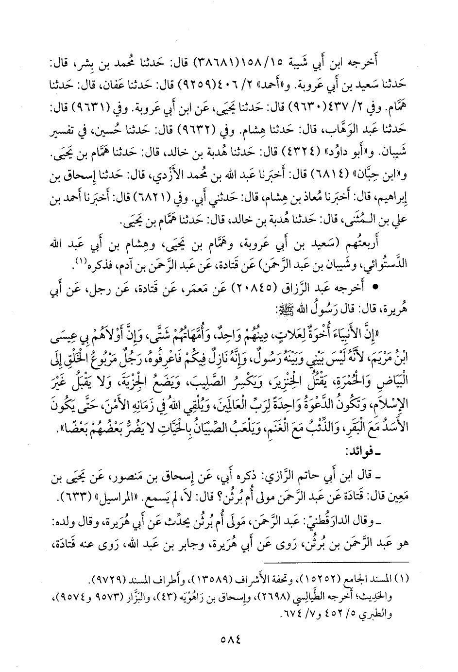 و «ابن حِبَّان» (٦٨١٤) قال: أخبرنا عبد الله بن محمد الأزدي، قال: حدثنا إسحاق بن إبراهيم، قال: أخبرنا معاذ بن هشام، قال: حدثني أبي. وفي (٦٨٢١) قال: أخبرنا أحمد بن علي بن المثنى، قال: حدثنا هُدبة بن خالد، قال: حدثنا همام بن يحيى.