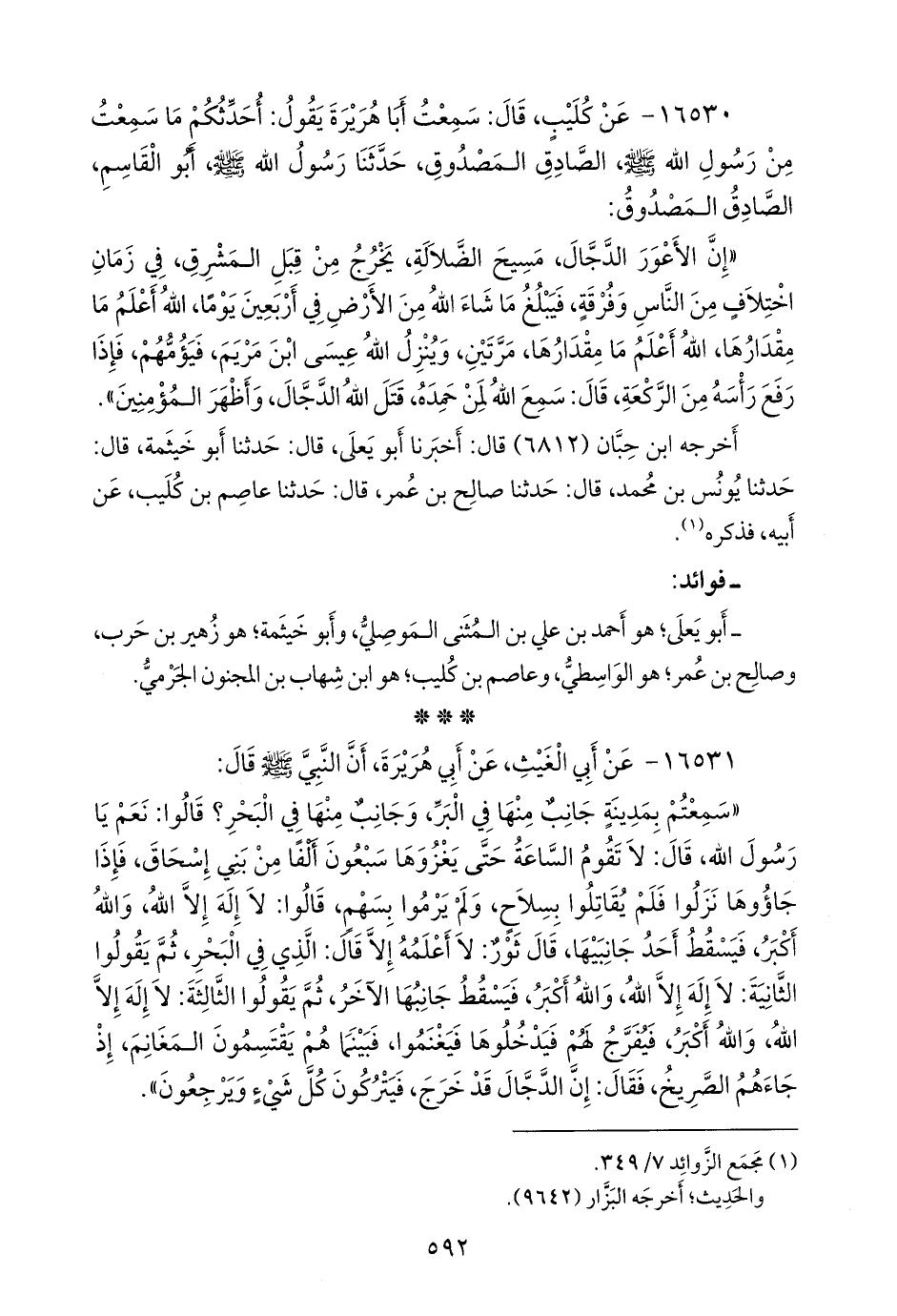 «إن الأعور الدجال، مسيح الضلالة، يخرج من قبل المشرق، في زمان اختلاف من الناس وفرقة، فيبلغ ما شاء الله من الأرض في أربعين يوما، الله أعلم ما مقدارها، الله أعلم ما مقدارها، مرتين، وينزل الله عيسى ابن مريم، فيؤمهم، فإذا رفع رأسه من الركعة، قال: سمع الله لمن حمده، قتل الله الدجال، وأظهر المؤمنين».