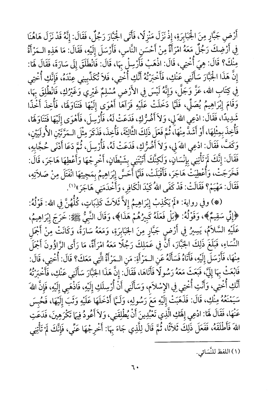 - وفي رواية: «لم يكذب إبراهيم إلا ثلاث كذبات، كلهن في الله: قوله: {إني سقيم}، وقوله: {بل فعله كبيرهم هذا}، وقال النبي صَلى الله عَليه وسَلم: خرج إبراهيم، عليه السلام، يسير في أرض جبار من الجبابرة، ومعه سارة، وكانت من أجمل النساء، فبلغ ذلك الجبار، أن في عملك رجلا معه امرأة، ما رأى الراؤون أجمل منها، فأرسل إليه، فأتاه فسأله عن المرأة: من المرأة التي معك؟ قال: أختي، قال: فابعث بها إلي، فبعث معه رسولا فأتاها، فقال: إن هذا الجبار سألني عنك، فأخبرته أنك أختي، وأنت أختي في الإسلام، وسألني أن أرسلك إليه، فاذهبي إليه، فإن الله سيمنعه منك، قال: فذهبت إليه مع رسوله، ولما أدخلها عليه وثب إليها، فحبس عنها، فقال لها: ادعي إلهك الذي تعبدين أن يطلقني، ولا أعود فيما تكرهين، فدعت الله فأطلقه، ففعل ذلك ثلاثا، ثم قال للذي جاء بها: أخرجها عني، فإنك لم تاتني