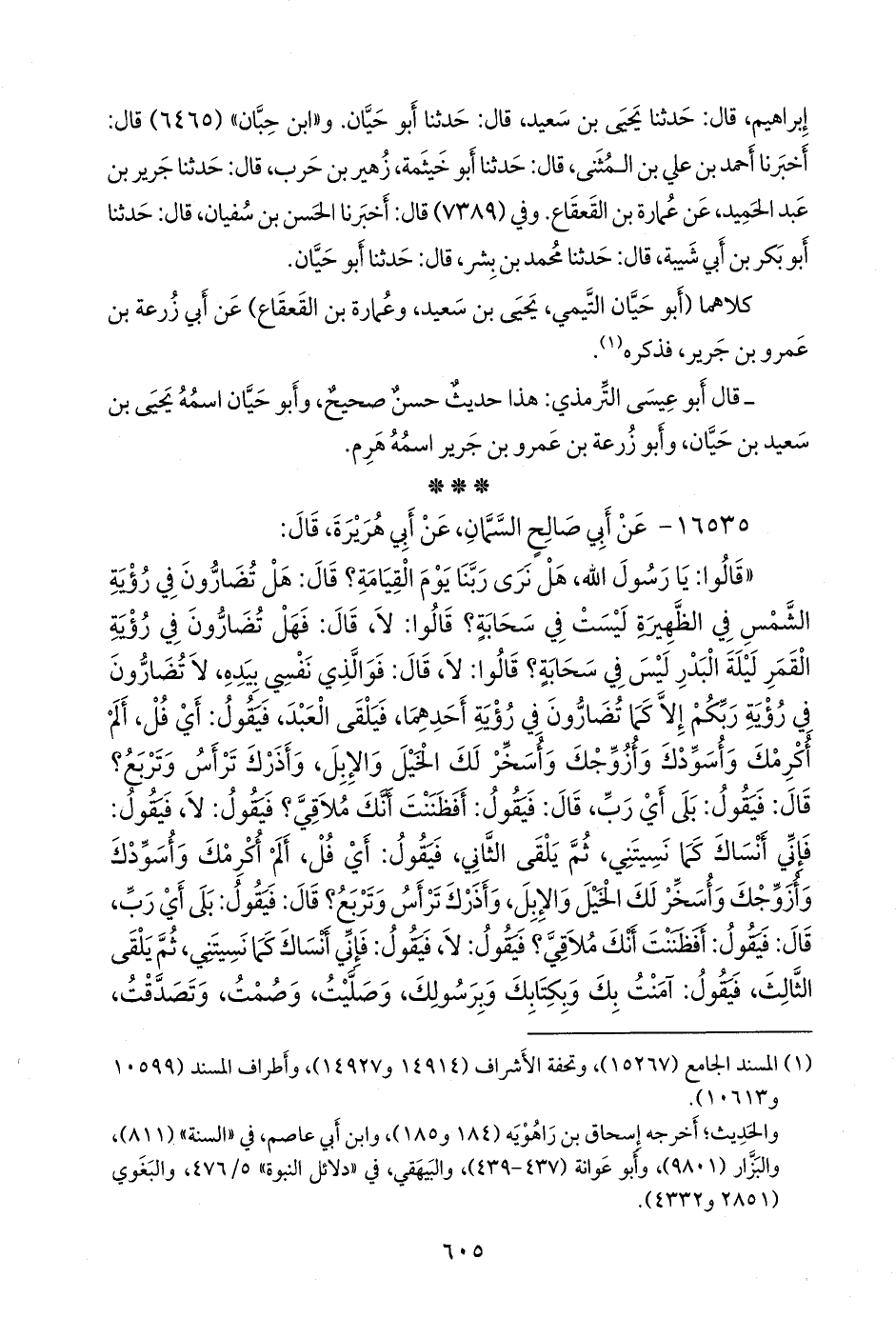 «قالوا: يا رسول الله، هل نرى ربنا يوم القيامة؟ قال: هل تضارون في رؤية الشمس في الظهيرة ليست في سحابة؟ قالوا: لا، قال: فهل تضارون في رؤية القمر ليلة البدر ليس في سحابة؟ قالوا: لا، قال: فوالذي نفسي بيده، لا تضارون في رؤية ربكم إلا كما تضارون في رؤية أحدهما، فيلقى العبد، فيقول: أي فل، ألم أكرمك وأسودك وأزوجك وأسخر لك الخيل والإبل، وأذرك ترأس وتربع؟ قال: فيقول: بلى أي رب، قال: فيقول: أفظننت أنك ملاقي؟ فيقول: لا، فيقول: فإني أنساك كما نسيتني، ثم يلقى الثاني، فيقول: أي فل، ألم أكرمك وأسودك وأزوجك وأسخر لك الخيل والإبل، وأذرك ترأس وتربع؟ قال: فيقول: بلى أي رب، قال: فيقول: أفظننت أنك ملاقي؟ فيقول: لا، فيقول: فإني أنساك كما نسيتني، ثم يلقى الثالث، فيقول: آمنت بك وبكتابك وبرسولك، وصليت، وصمت، وتصدقت،
