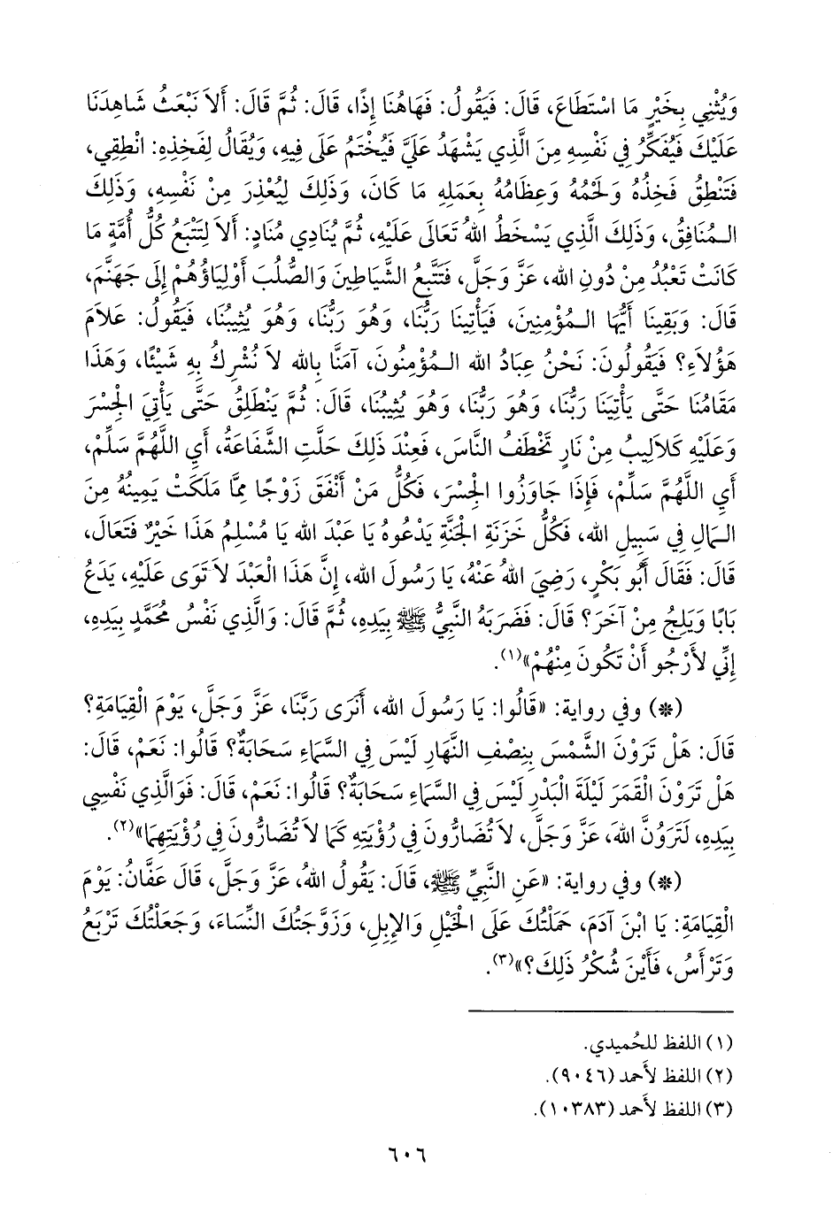 قال: ثم ينطلق حتى يأتي الجسر وعليه كلاليب من نار تخطف الناس، فعند ذلك حلت الشفاعة، أي اللهم سلم، أي اللهم سلم، فإذا جاوزوا الجسر، فكل من أنفق زوجا مما ملكت يمينه من المال في سبيل الله، فكل خزنة الجنة يدعوه يا عبد الله يا مسلم هذا خير فتعال، قال: فقال أَبو بكر، رضي الله عنه، يا رسول الله، إن هذا العبد لا توى عليه، يدع بابا ويلج من آخر؟ قال: فضربه النبي صَلى الله عَليه وسَلم بيده، ثم قال: والذي نفس محمد بيده، إني لأرجو أن تكون منهم» (¬١).