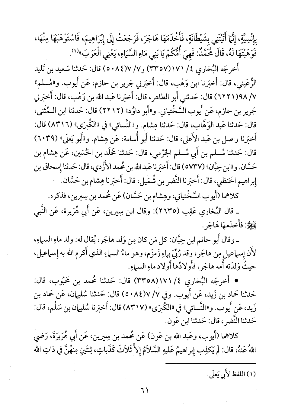 - قال البخاري عقب (٢٦٣٥): وقال ابن سِيرين، عن أبي هريرة، عن النبي صَلى الله عَليه وسَلم: فأخدمها هاجر.