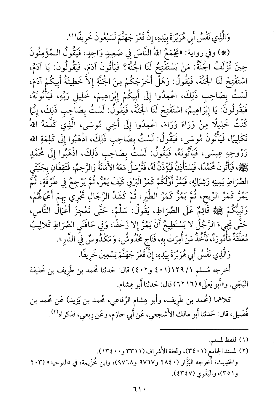 - وفي رواية: «يجمع الله الناس في صعيد واحد، فيقول المؤمنون حين تزلف الجنة: من يستفتح لنا باب الجنة؟ فيأتون آدم، فيقولون: يا آدم، استفتح لنا الجنة، فيقول: وهل أَخرجكم من الجنة إِلا خطيئة أَبيكم آدم، لست بصاحب ذلك، اعمدوا إِلى أَبيكم إِبراهيم، خليل ربه، فيأتونه، فيقولون: يا إِبراهيم، استفتح لنا الجنة، فيقول: لست بصاحب ذلك، إِنما كنت خليلا من وراء وراء، اعمدوا إِلى أَخي موسى الذي كلمه الله تكليما، فيأتون موسى، فيقول: لست بصاحب ذلك، اذهبوا إِلى كلمة الله وروحه عيسى، فيأتونه، فيقول: لست بصاحب ذلك، اذهبوا إِلى محمد صَلى الله عَليه وسَلم، فيأتون محمدا، فيستأذن فيؤذن له، فترسل معه الأَمانة والرحم، فتقفان بجنبتي الصراط يمينه وشماله، فيمر أَولكم كمر البرق كيف يمر، ثم يرجع في طرفة، ثم يمر كمر الريح، ثم يمر كمر الطير، ثم كشد الرجل تجري بهم أَعمالهم، ونبيكم صَلى الله عَليه وسَلم قائم على الصراط، يقول: سلم سلم، حتى تعجز أَعمال الناس، حتى يجيء الرجل لا يستطيع أَن يمر إِلا زحفا، وفي حافتي الصراط كلاليب معلقة مأمورة، تأخذ من أُمرت به، فناج مخدوش، ومكدوس في النار».