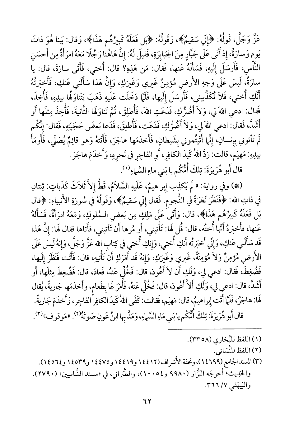قوله: {إني سقيم}، وقوله: {بل فعله كبيرهم هذا}، وقال: بينا هو ذات يوم وسارة، إذ أتى على جبار من الجبابرة، فقيل له: إن هاهنا رجلا معه امرأة من أحسن الناس، فأرسل إليه، فسأله عنها، فقال: من هذه؟ قال: أختي، فأتى سارة، قال: يا سارة، ليس على وجه الأرض مؤمن غيري وغيرك، وإن هذا سألني عنك، فأخبرته أنك أختي، فلا تكذبيني، فأرسل إليها، فلما دخلت عليه ذهب يتناولها بيده، فأخذ، فقال: ادعي الله لي، ولا أضرك، فدعت الله، فأطلق، ثم تناولها الثانية، فأخذ مثلها أو أشد، فقال: ادعي الله لي، ولا أضرك، فدعت، فأطلق، فدعا بعض حجبته، فقال: إنكم لم تأتوني بإنسان، إنما أتيتموني بشيطان، فأخدمها هاجر، فأتته وهو قائم يصلي، فأومأ بيده: مهيم، قالت: رد الله كيد الكافر، أو الفاجر في نحره، وأخدم هاجر.