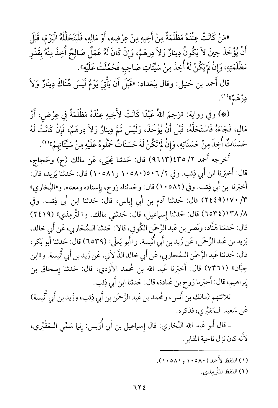 و «البخاري» ٣/ ١٧٠ (٢٤٤٩) قال: حدثنا آدم بن أبي إياس، قال: حدثنا ابن أبي ذِئب. وفي ٨/ ١٣٨ (٦٥٣٤) قال: حدثنا إسماعيل، قال: حدثني مالك. و «التِّرمِذي» (٢٤١٩) قال: حدثنا هَنَّاد، ونصر بن عبد الرَّحمَن الكوفي، قالا: حدثنا المحاربي، عن أبي خالد، يزيد بن عبد الرَّحمَن، عن زيد بن أَبي أُنيسة. و «أَبو يَعلى» (٦٥٣٩) قال: حدثنا أَبو بكر، قال: حدثنا عبد الرَّحمَن المحاربي، عن أبي خالد الدالاني، عن زيد بن أَبي أُنيسة. و «ابن حِبَّان» (٧٣٦١) قال: أخبرنا عبد الله بن محمد الأزدي، قال: حدثنا إسحاق بن إبراهيم، قال: أخبرنا روح بن عبادة، قال: حدثنا ابن أبي ذِئب.