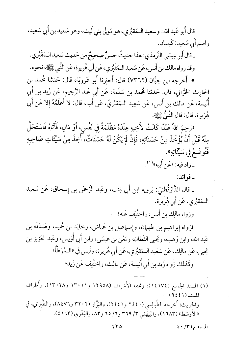• أَخرجه ابن حبان (٧٣٦٢) قال: أخبرنا أَبو عَروبَة، قال: حدثنا محمد بن الحارث الحراني، قال: حدثنا محمد بن سلمة، عن أبي عبد الرحيم، عن زيد بن أَبي أُنيسة، عن مالك بن أنس، عن سعيد المَقبُري، عن أبيه، قال: لا أعلمه إلا عن أبي هريرة، قال: قال النبي صَلى الله عَليه وسَلم: