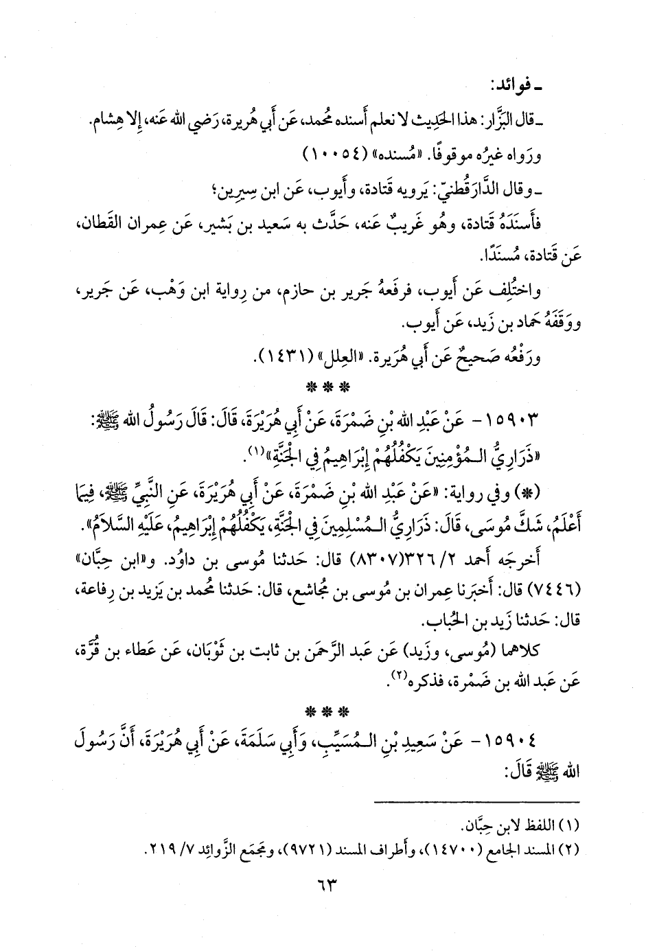 - وفي رواية: «عن عبد الله بن ضمرة، عن أبي هريرة، عن النبي صَلى الله عَليه وسَلم فيما أعلم، شك موسى، قال: ذراري المسلمين في الجنة، يكفلهم إبراهيم، عليه السلام».