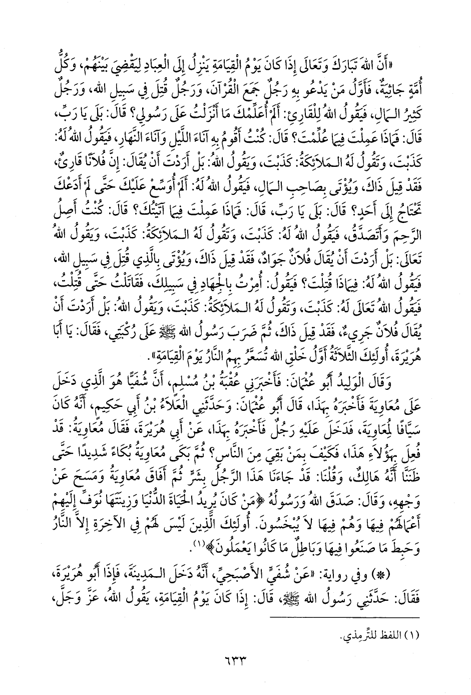 ويؤتى بالذي قتل في سبيل الله، فيقول الله له: في ماذا قتلت؟ فيقول: أمرت بالجهاد في سبيلك، فقاتلت حتى قتلت، فيقول الله تعالى له: كذبت، وتقول له الملائكة: كذبت، ويقول الله: بل أردت أن يقال فلان جريء، فقد قيل ذاك، ثم ضرب رسول الله صَلى الله عَليه وسَلم على ركبتي، فقال: يا أبا هريرة، أولئك الثلاثة أول خلق الله تسعر بهم النار يوم القيامة».