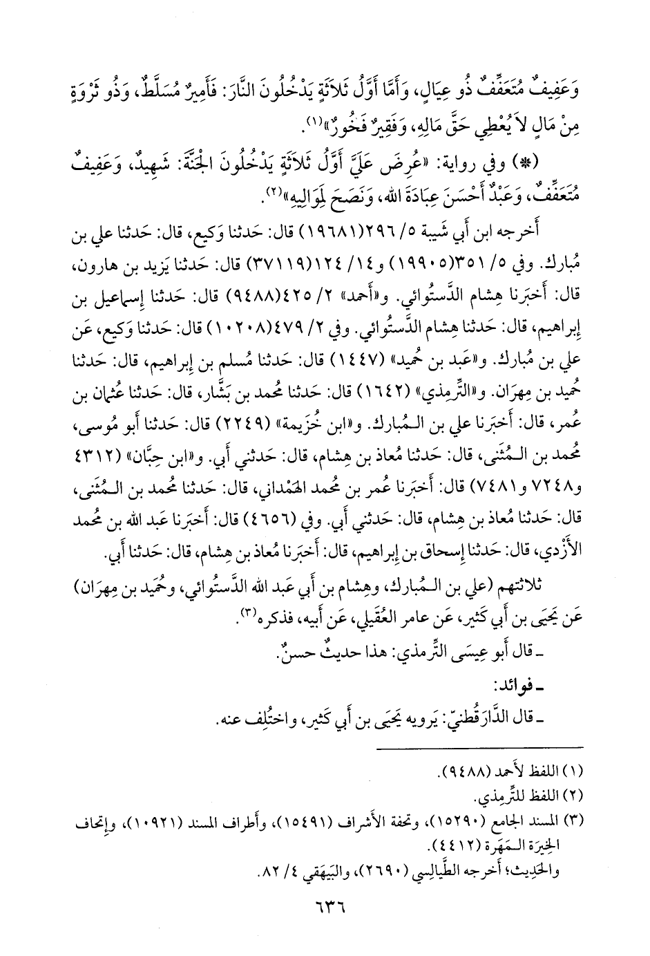 و «عَبد بن حُميد» (١٤٤٧) قال: حدثنا مسلم بن إبراهيم، قال: حدثنا حميد بن مِهران. و «التِّرمِذي» (١٦٤٢) قال: حدثنا محمد بن بشار، قال: حدثنا عثمان بن عمر، قال: أخبرنا علي بن المبارك. و «ابن خزيمة» (٢٢٤٩) قال: حدثنا أَبو موسى، محمد بن المثنى، قال: حدثنا معاذ بن هشام، قال: حدثني أبي. و «ابن حِبَّان» (٤٣١٢ و ٧٢٤٨ و ٧٤٨١) قال: أخبرنا عمر بن محمد الهمداني، قال: حدثنا محمد بن المثنى، قال: حدثنا معاذ بن هشام، قال: حدثني أبي. وفي (٤٦٥٦) قال: أخبرنا عبد الله بن محمد الأزدي، قال: حدثنا إسحاق بن إبراهيم، قال: أخبرنا معاذ بن هشام، قال: حدثنا أبي.