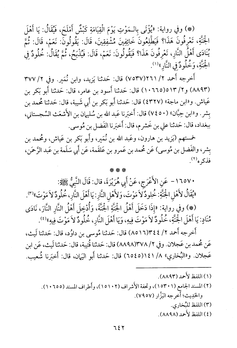 - وفي رواية: «إذا دخل أهل الجنة الجنة، وأهل النار النار، نادى مناد: يا أهل الجنة، خلود فلا موت فيه، ويا أهل النار، خلود، فلا موت فيه» (¬٢).