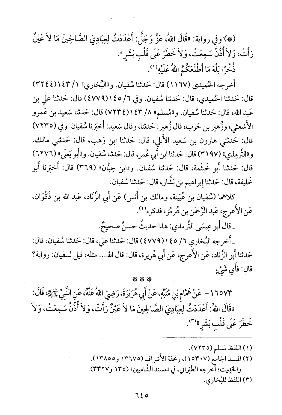 «قال الله: أعددت لعبادي الصالحين ما لا عين رأت، ولا أذن سمعت، ولا خطر على قلب بشر» (¬١).