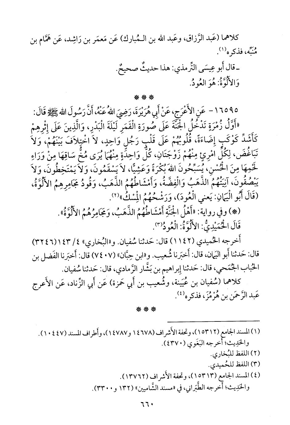 «أول زمرة تدخل الجنة على صورة القمر ليلة البدر، والذين على إثرهم كأشد كوكب إضاءة، قلوبهم على قلب رجل واحد، لا اختلاف بينهم، ولا تباغض، لكل امرئ منهم زوجتان، كل واحدة منهما يرى مخ ساقها من وراء لحمها من الحسن، يسبحون الله بكرة وعشيا، لا يسقمون، ولا يمتخطون، ولا يبصقون، آنيتهم الذهب والفضة، وأمشاطهم الذهب، وقود مجامرهم الألوة، (قال أَبو اليمان: يعني العود)، ورشحهم المسك» (¬١).