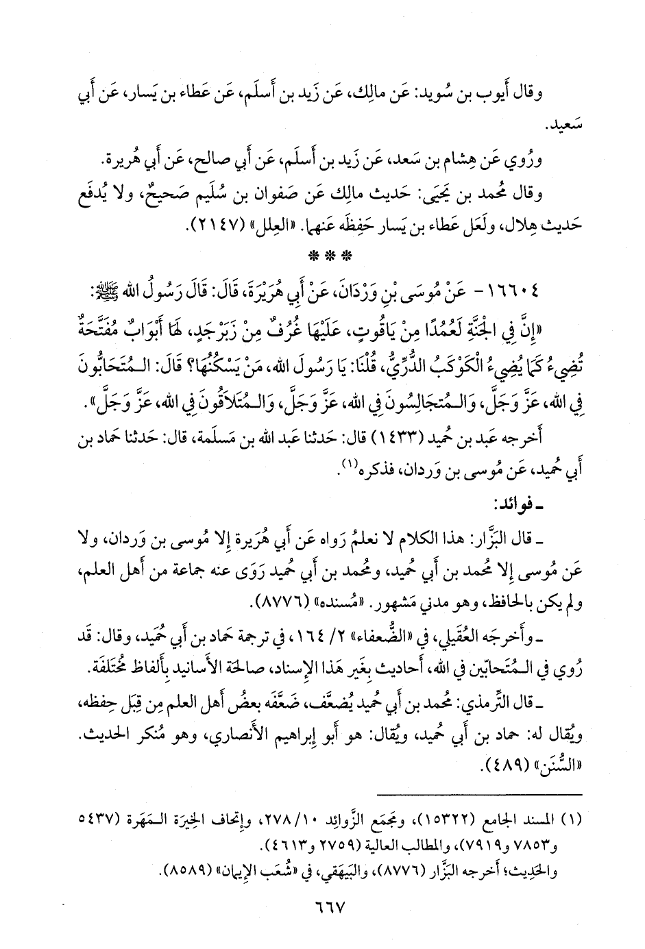 - وقال البزار: هذا الكلام لا نعلم رواه عن أبي هريرة إلا موسى بن وَردان، ولا عن موسى إلا محمد بن أبي حميد، ومحمد بن أبي حميد روى عنه جماعة من أهل العلم، ولم يكن بالحافظ، وهو مدني مشهور. «مسنده» (٨٧٧٦).