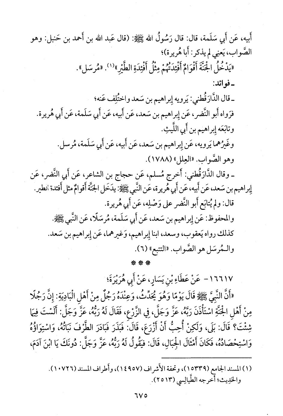 - وقال الدارقُطني أيضا: أخرج مسلم، عن حجاج بن الشاعر، عن أبي النضر، عن إبراهيم بن سعد، عن أبيه، عن أبي سلمة، عن أبي هريرة، عن النبي صَلى الله عَليه وسَلم؛ يدخل الجنة أقوام أفئدتهم مثل أفئدة الطير.
