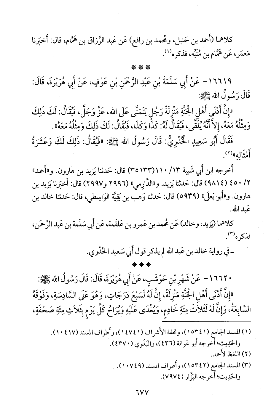 «إن أدنى أهل الجنة منزلة، إن له لسبع درجات، وهو على السادسة، وفوقه السابعة، وإن له لثلاث مئة خادم، ويغدى عليه ويراح كل يوم بثلاث مئة صحفة،