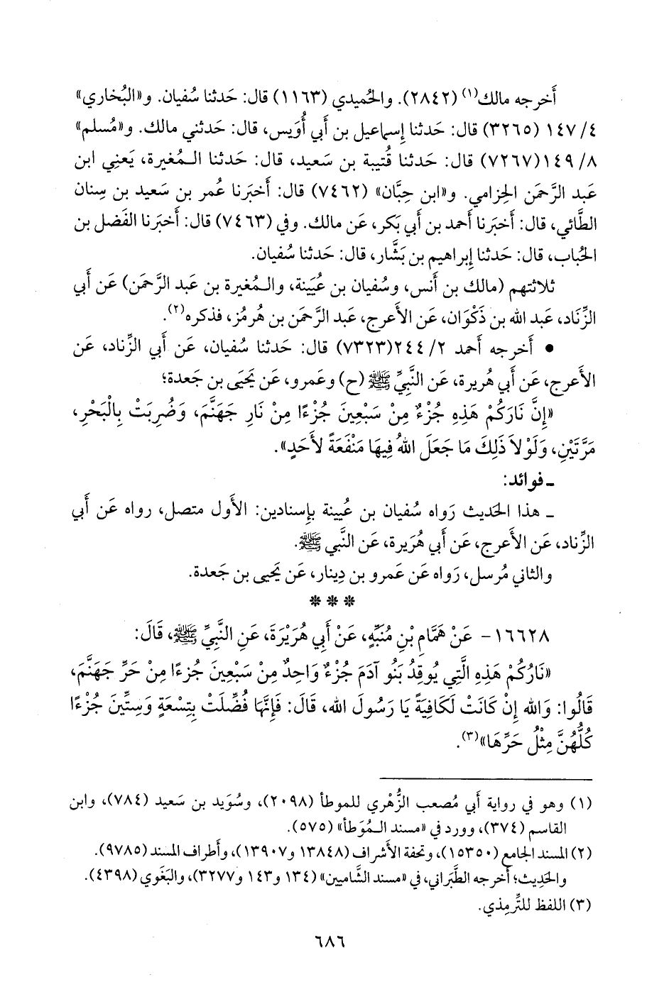 ثلاثتهم (مالك بن أنس، وسفيان بن عُيينة، والمغيرة بن عبد الرَّحمَن) عن أبي الزناد عبد الله بن ذكوان، عن الأعرج عبد الرَّحمَن بن هُرمُز، فذكره (¬١).