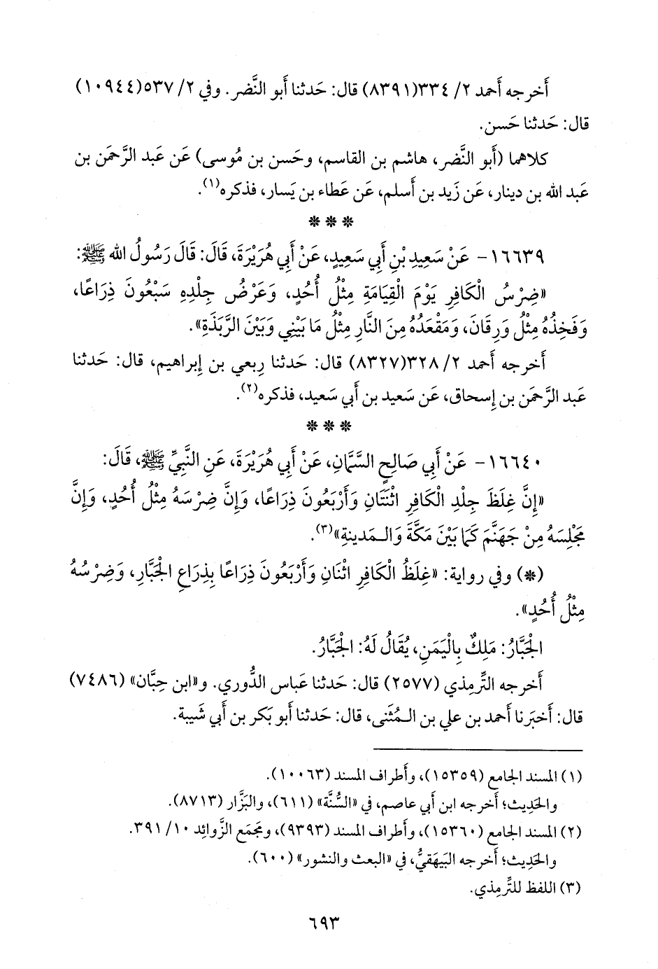 «ضرس الكافر يوم القيامة مثل أحد، وعرض جلده سبعون ذراعا، وفخذه مثل ورقان، ومقعده من النار مثل ما بيني وبين الربذة».
