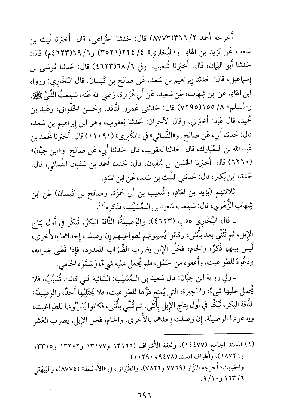 - وفي رواية ابن حبان: قال سعيد بن المُسَيب: السائبة التي كانت تسيب، فلا يحمل عليها شيء، والبحيرة؛ التي يمنع درها للطواغيت، فلا يحتلبها أحد، والوصيلة؛ الناقة البكر، تبكر في أول نتاج الإبل بأنثى، ثم تثني بأنثى، فكانوا يسيبونها للطواغيت، ويدعونها الوصيلة، إن وصلت إحدهما بالأخرى، والحام؛ فحل الإبل، يضرب العشر