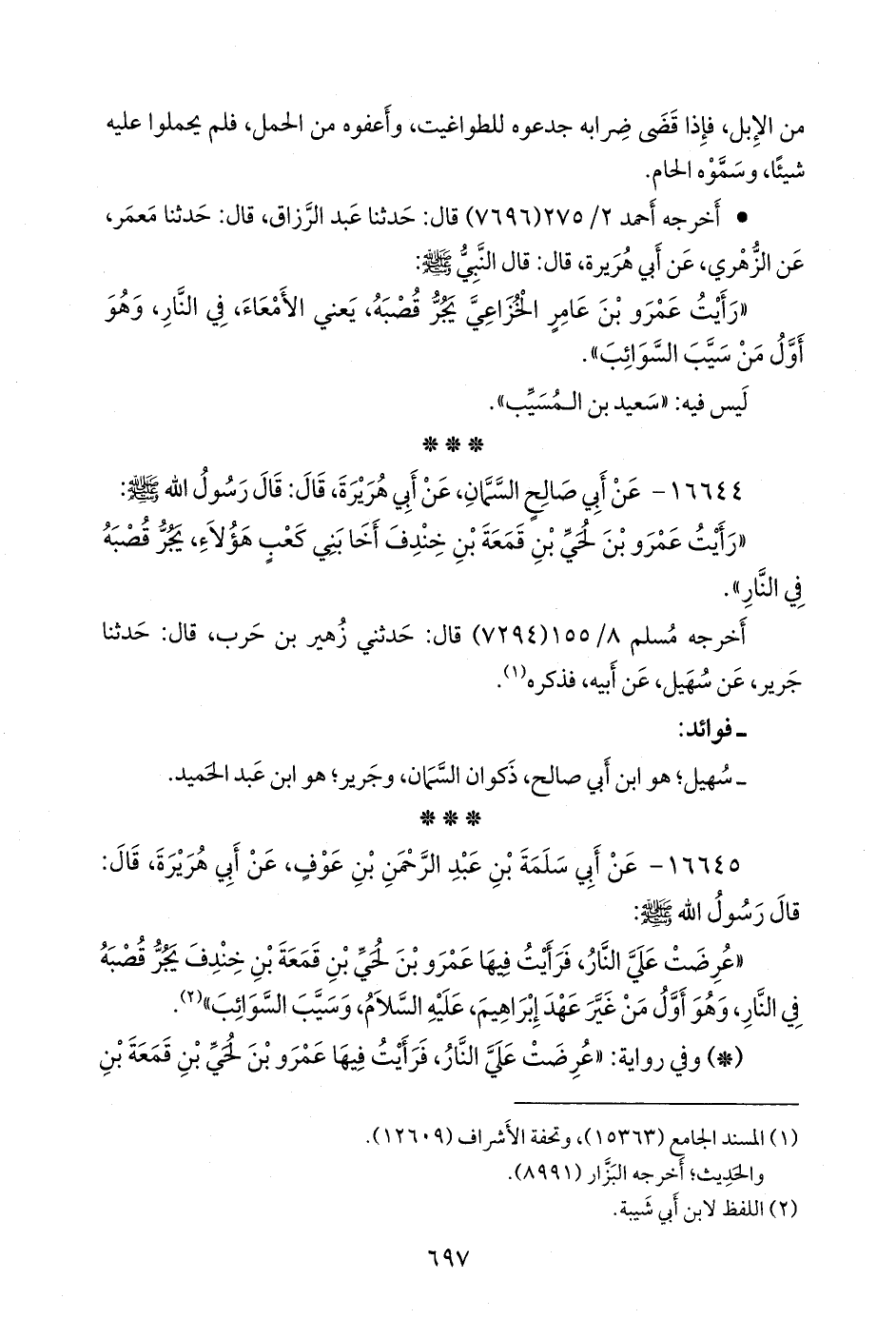 «عرضت علي النار، فرأيت فيها عَمرو بن لحي بن قمعة بن خندف يجر قصبه في النار، وهو أول من غير عهد إبراهيم، عليه السلام، وسيب السوائب» (¬١).