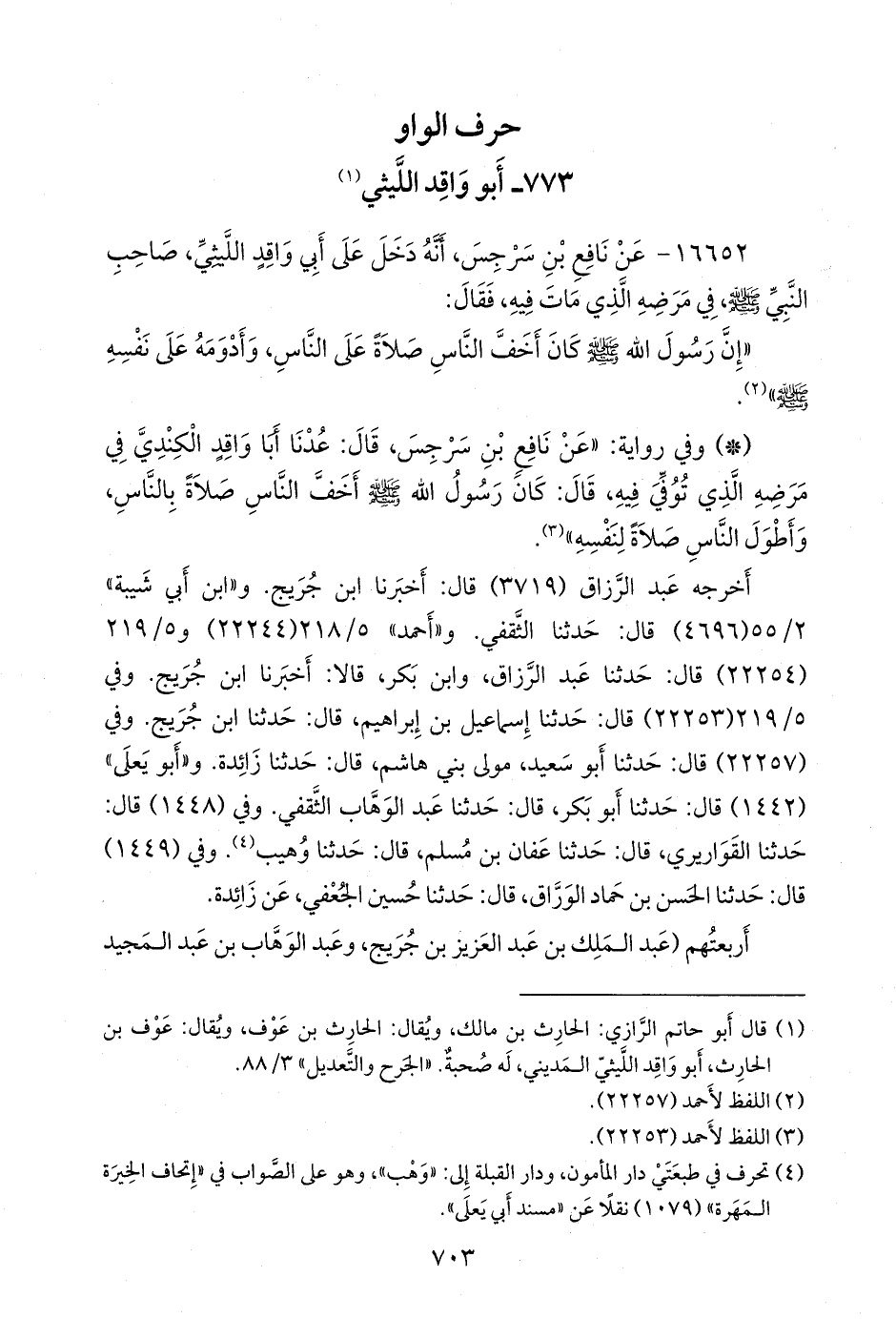- وفي رواية: «عن نافع بن سرجس، قال: عدنا أبا واقد الكندي في مرضه الذي توفي فيه، قال: كان رسول الله صَلى الله عَليه وسَلم أخف الناس صلاة بالناس، وأطول الناس صلاة لنفسه» (¬٣).