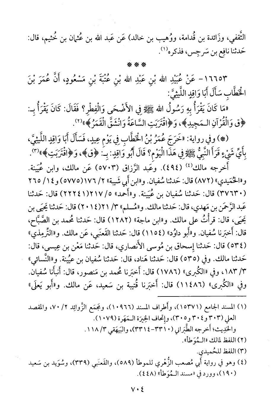 - وفي رواية: «خرج عمر بن الخطاب في يوم عيد، فسأل أبا واقد الليثي، بأي شيء قرأ النبي صَلى الله عَليه وسَلم في هذا اليوم؟ قال أَبو واقد: بـ: {ق}، و {اقتربت}» (¬٢).