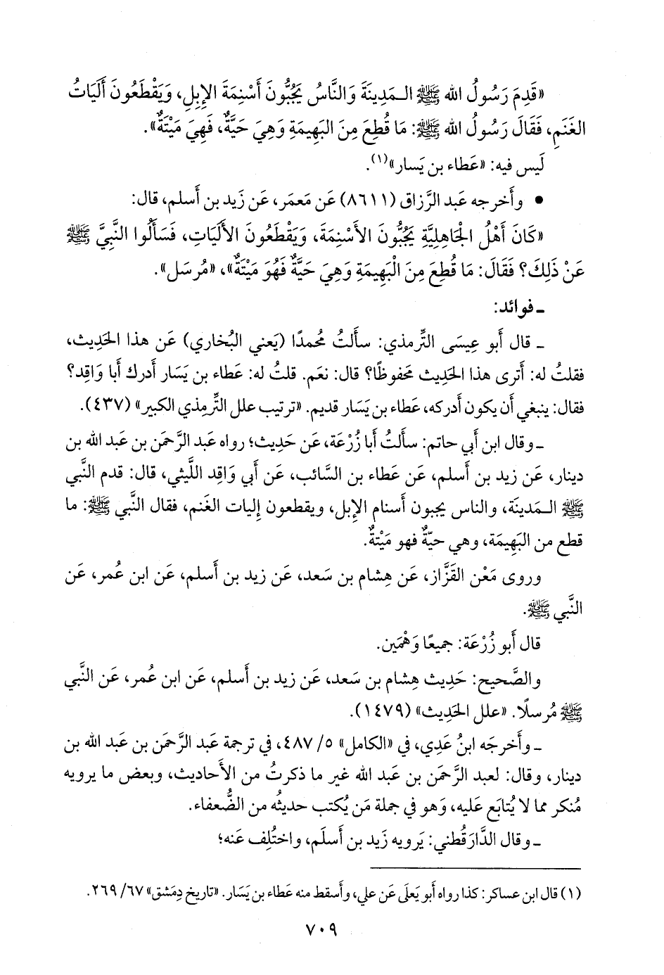 - وقال ابن أبي حاتم: سألت أَبا زُرعَة، عن حديث؛ رواه عبد الرَّحمَن بن عبد الله بن دينار، عن زيد بن أسلم، عن عطاء بن السائب، عن أبي واقد الليثي، قال: قدم النبي صَلى الله عَليه وسَلم المدينة، والناس يجبون أسنام الإبل، ويقطعون إليات الغنم، فقال النبي صَلى الله عَليه وسَلم: ما قطع من البهيمة، وهي حية فهو ميتة.