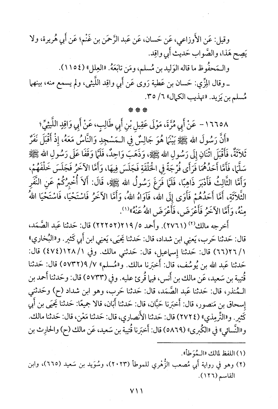 مسكين، قراءة عليه وأنا أسمع، عن ابن القاسم، قال: أخبرنا مالك. وفي (٥٨٧٠) قال: أخبرنا علي بن سعيد بن جرير، قال: حدثنا عبد الصمد، قال: حدثنا حرب بن شداد، قال: حدثنا يحيى بن أبي كثير. و «أَبو يَعلى» (١٤٤٥) قال: حدثنا أحمد بن إبراهيم الدورقي، قال: حدثنا عبد الصمد، قال: حدثنا حرب، قال: حدثنا يحيى. و «ابن حِبَّان» (٨٦) قال: أخبرنا عمر بن سعيد بن سنان، قال: حدثنا أحمد بن أَبي بكر، عن مالك.