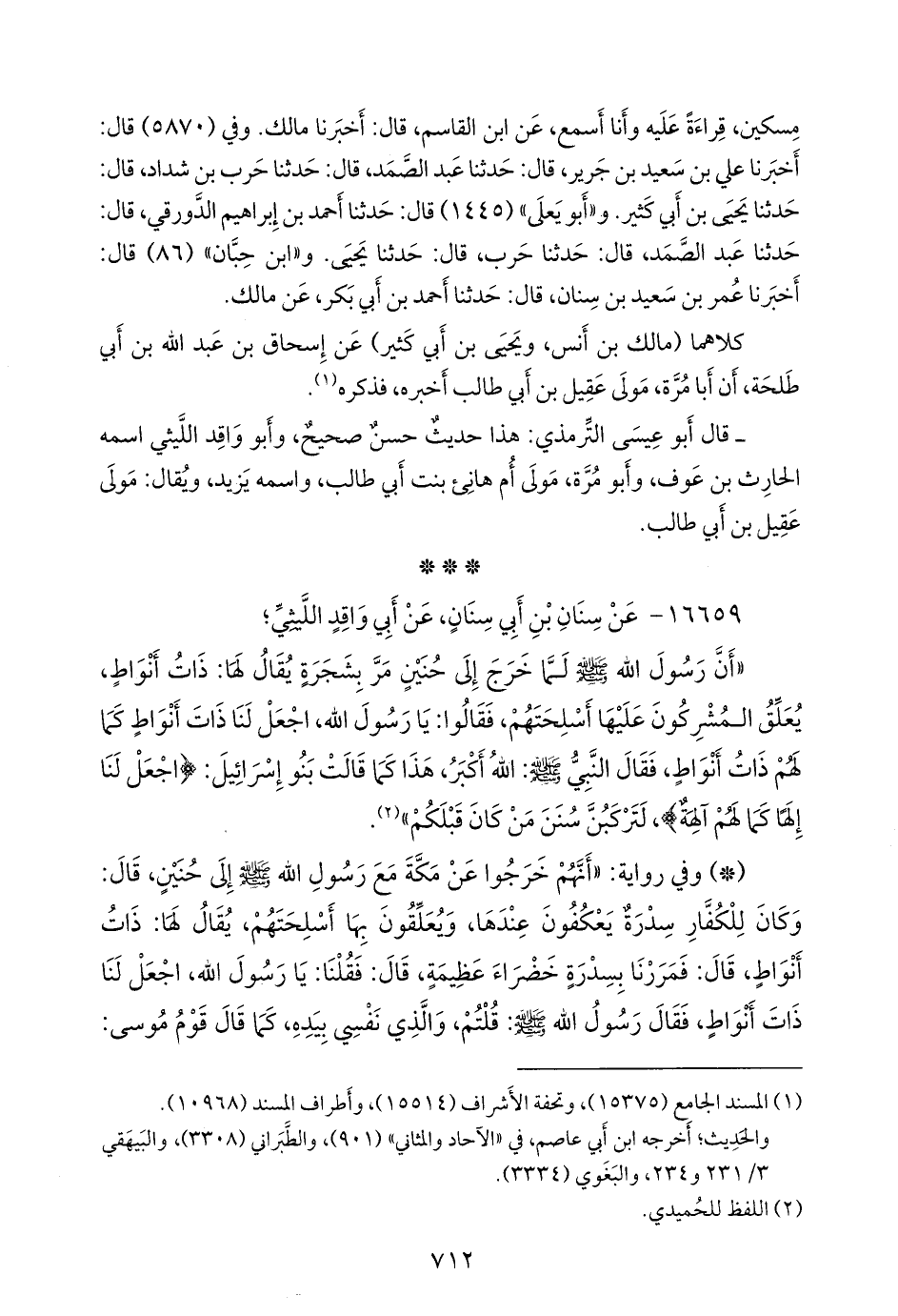 - وفي رواية: «أنهم خرجوا عن مكة مع رسول الله صَلى الله عَليه وسَلم إلى حنين، قال: وكان للكفار سدرة يعكفون عندها، ويعلقون بها أسلحتهم، يقال لها: ذات أنواط، قال: فمررنا بسدرة خضراء عظيمة، قال: فقلنا: يا رسول الله، اجعل لنا ذات أنواط، فقال رسول الله صَلى الله عَليه وسَلم: قلتم، والذي نفسي بيده، كما قال قوم موسى: