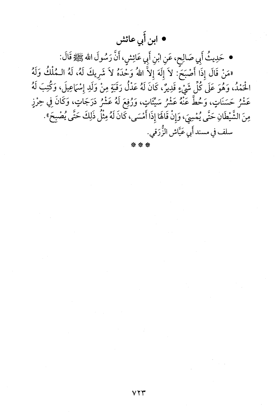 «من قال إذا أصبح: لا إله إلا الله وحده لا شريك له، له الملك وله الحمد، وهو على كل شيء قدير، كان له عدل رقبة من ولد إسماعيل، وكتب له عشر حسنات، وحط عنه عشر سيئات، ورفع له عشر درجات، وكان في حرز من الشيطان حتى يمسي، وإن قالها إذا أمسى، كان له مثل ذلك حتى يصبح».