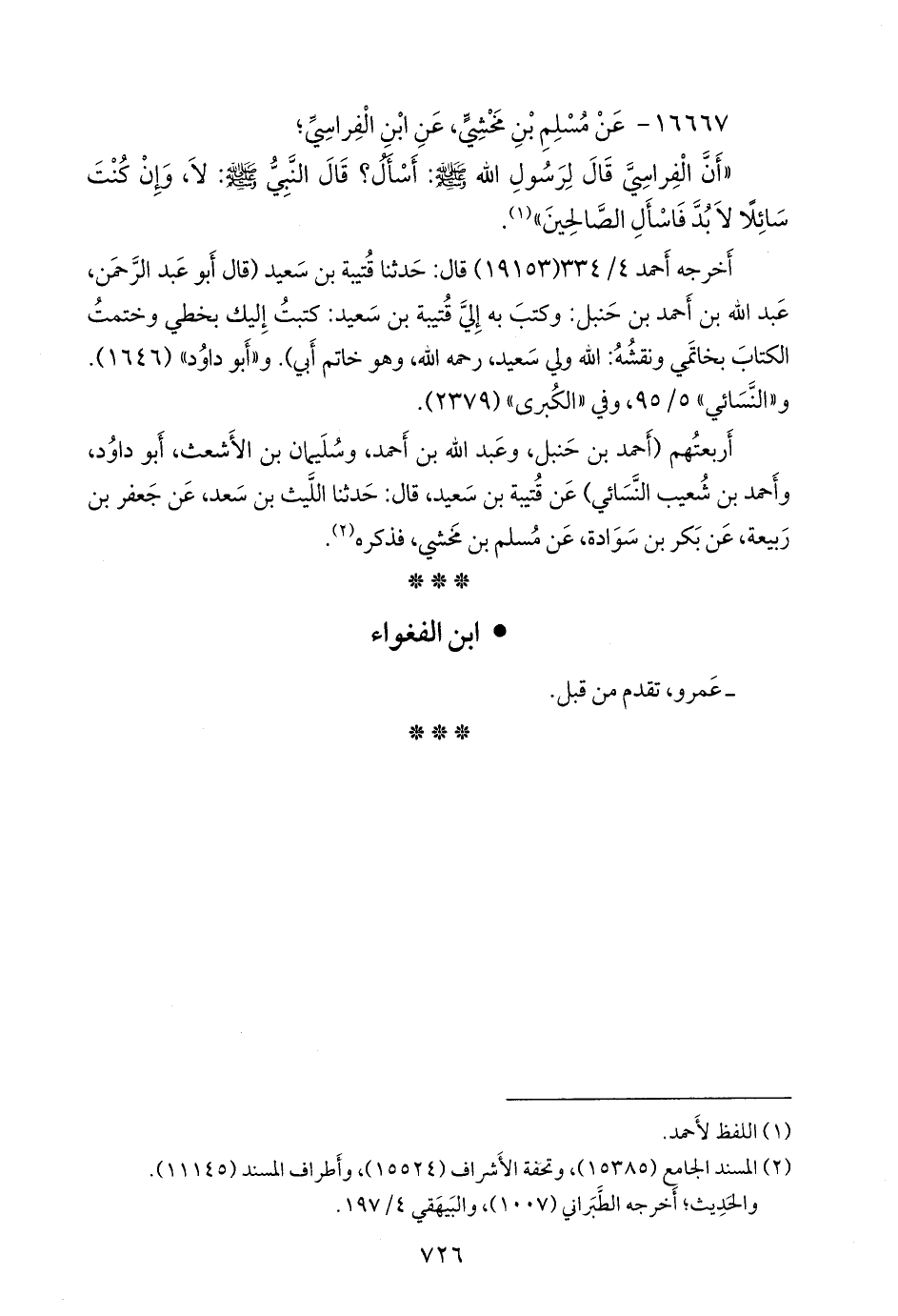 (¬٢) المسند الجامع (١٥٣٨٥)، وتحفة الأشراف (١٥٥٢٤)، وأطراف المسند (١١١٤٥).