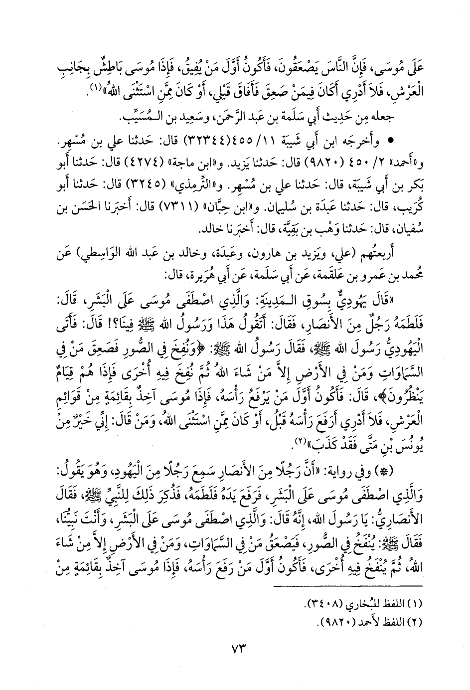 - وفي رواية: «أن رجلا من الأنصار سمع رجلا من اليهود، وهو يقول: والذي اصطفى موسى على البشر، فرفع يده فلطمه، فذكر ذلك للنبي صَلى الله عَليه وسَلم فقال الأَنصاري: يا رسول الله، إنه قال: والذي اصطفى موسى على البشر، وأنت نبينا، فقال صَلى الله عَليه وسَلم: ينفخ في الصور، فيصعق من في السماوات، ومن في الأرض إلا من شاء الله، ثم ينفخ فيه أخرى، فأكون أول من رفع رأسه، فإذا موسى آخذ بقائمة من