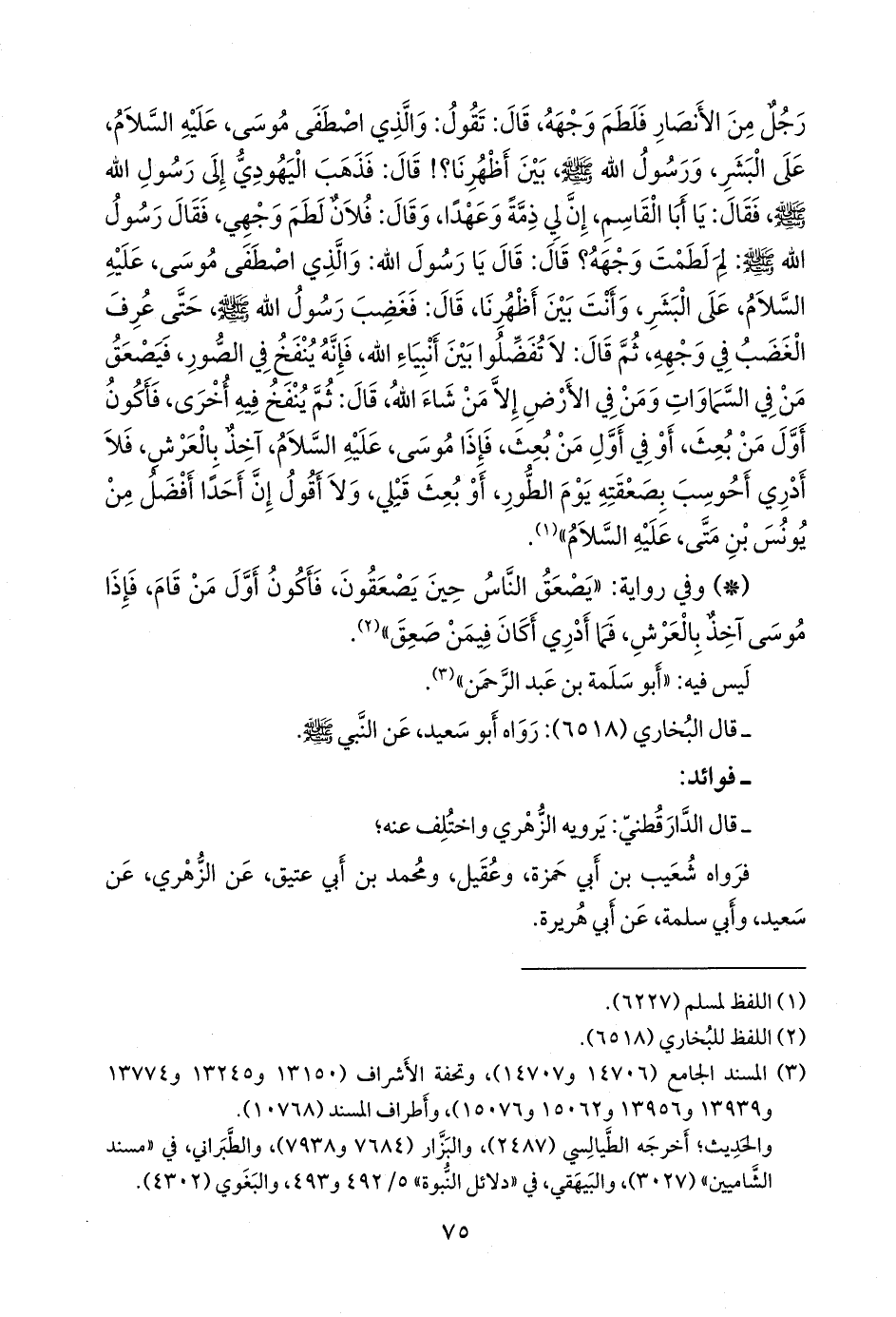 قال: تقول: والذي اصطفى موسى، عليه السلام، على البشر، ورسول الله صَلى الله عَليه وسَلم بين أظهرنا؟! قال: فذهب اليهودي إلى رسول الله صَلى الله عَليه وسَلم فقال: يا أبا القاسم، إن لي ذمة وعهدا، وقال: فلان لطم وجهي، فقال رسول الله صَلى الله عَليه وسَلم: لم لطمت وجهه؟ قال: قال يا رسول الله: والذي اصطفى موسى، عليه السلام، على البشر، وأنت بين أظهرنا، قال: فغضب رسول الله صَلى الله عَليه وسَلم حتى عرف الغضب في وجهه، ثم قال: لا تفضلوا بين أنبياء الله، فإنه ينفخ في الصور، فيصعق من في السماوات ومن في الأرض إلا من شاء الله، قال: ثم ينفخ فيه أخرى، فأكون أول من بعث، أو في أول من بعث، فإذا موسى، عليه السلام، آخذ بالعرش، فلا أدري أحوسب بصعقته يوم الطور، أو بعث قبلي، ولا أقول إن أحدا أفضل من يونس بن متى، عليه السلام» (¬١).