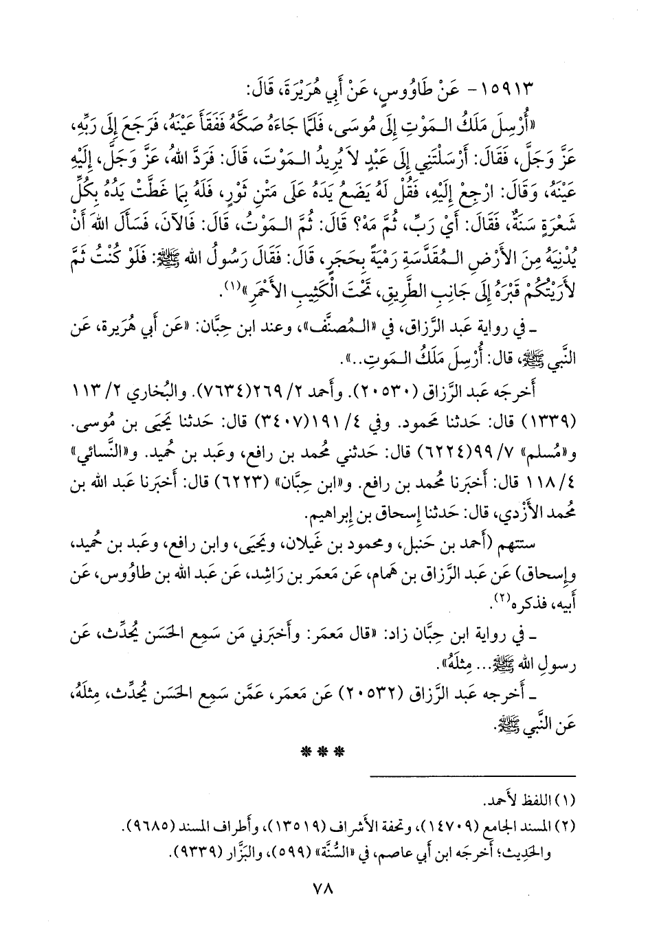 - في رواية عبد الرزاق في «المُصَنَّف»، وعند ابن حبان: «عن أبي هريرة، عن النبي صَلى الله عَليه وسَلم قال: أرسل ملك الموت».