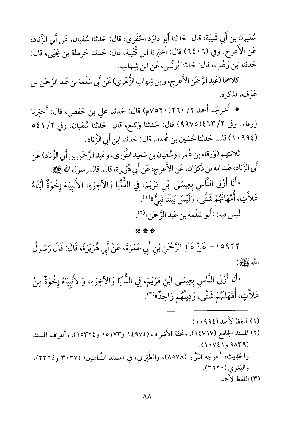 «أنا أولى الناس بعيسى ابن مريم، في الدنيا والآخرة، والأنبياء إخوة من علات، أمهاتهم شتى، ودينهم واحد» (¬١).