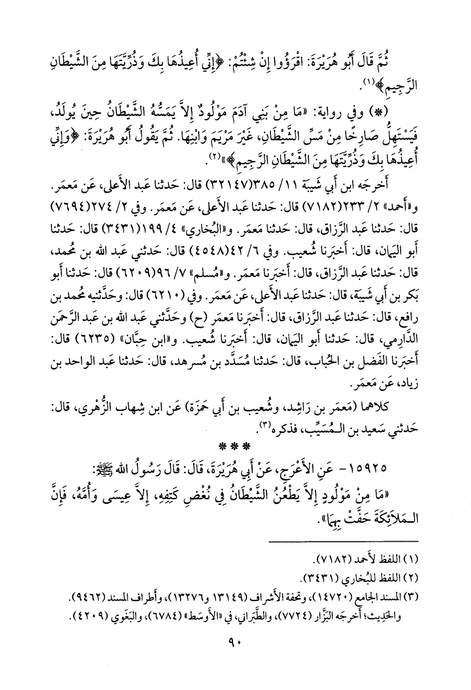 ثلاثتهم (سفيان بن عُيينة، والمغيرة بن عبد الرَّحمَن، وشعيب بن أبي حمزة) عن أبي الزناد عبد الله بن ذكوان، عن عبد الرَّحمَن بن هُرمُز الأعرج فذكره (¬٣).