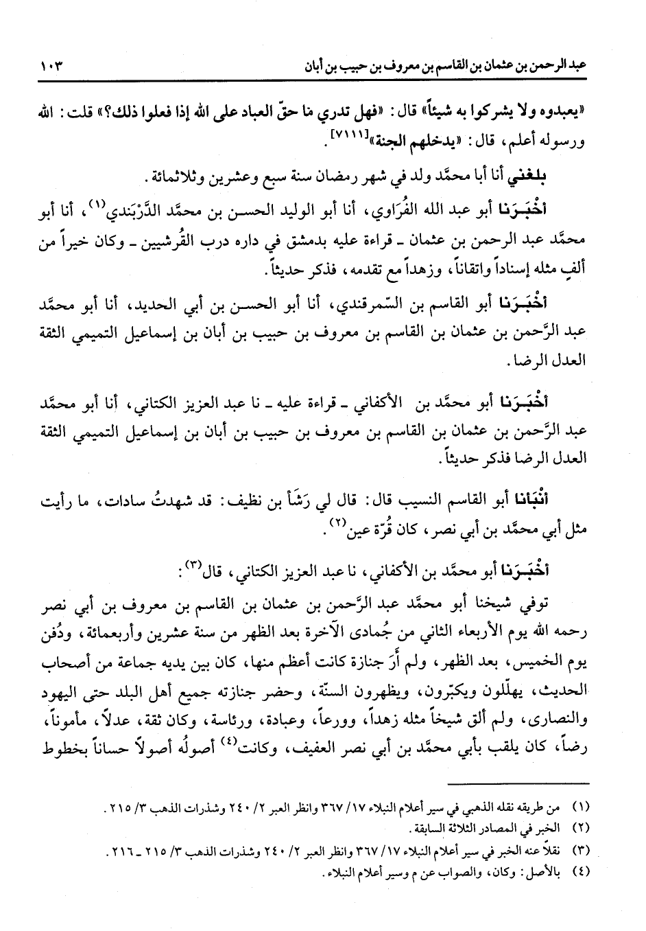 [7111] بلغني أنا أبا محمد ولد في شهر رمضان سنة سبع وعشرين وثلاثمائة أخبرنا أبو عبد الله الفراوي أنا أبو الوليد الحسن بن محمد الدربندي (1) أنا أبو محمد عبد الرحمن بن عثمان قراءة عليه بدمشق في داره درب القرشيين وكان خيرا من ألف مثله اسنادا واتقأنا وزهدا مع تقدمه فذكر حديثا أخبرنا أبو القاسم بن السمرقندي أنا أبو الحسن بن أبي الحديد أنا أبو محمد عبد الرحمن بن عثمان بن القاسم بن معروف بن حبيب بن أبان بن اسماعيل التميمي الثقة العدل الرضا أخبرنا أبو محمد بن الأكفاني قراءة عليه نا عبد العزيز الكتاني أنا أبو محمد عبد الرحمن بن عثمان بن القاسم بن معروف بن حبيب بن أبان بن اسماعيل التميمي الثقة العدل الرضا فذكر حديثا أنبأنا أبو القاسم النسيب قال قال لي رشأ بن نظيف قد شهدت سادات ما رأيت مثل أبي محمد بن أبي نصر كان قرة عين (2) أخبرنا أبو محمد بن الأكفاني نا عبد العزيز الكتاني قال (3) توفي شيخنا أبو محمد عبد الرحمن بن عثمان بن القاسم بن معروف بن أبي نصر رحمه الله يوم الأربعاء الثاني من جمادى الآخرة بعد الظهر من سنة عشرين وأربعمائة ودفن يوم الخميس بعد الظهر ولم أر جنازة كانت أعظم منها كان بين يديه جماعة من أصحاب الحديث يهللون ويكبرون ويظهرون السنة وحضر جنازته جميع أهل البلد حتى اليهود والنصارى ولم ألق شيخا مثله زهدا وورعا وعبادة ورئاسة وكان ثقة عدلا مأمونا رضا كان يلقب بأبي محمد بن أبي نصر العفيف وكانت (4) أصوله أصولا حسأنا بخطوط