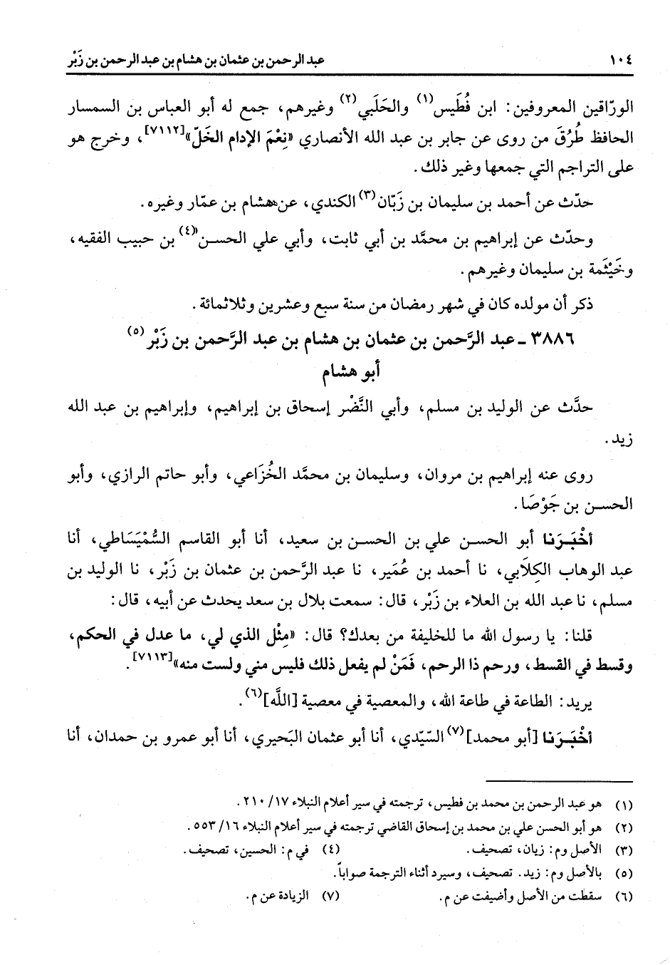 3886 - عبد الرحمن بن عثمان بن هشام بن عبد الرحمن بن زبر (5) أبو هشام حدث عن الوليد بن مسلم وأبي النضر اسحاق بن ابراهيم وابراهيم بن عبد الله زيد روى عنه ابراهيم بن مروان وسليمان بن محمد الخزاعي وأبو حاتم الرازي وأبو الحسن بن جوصا أخبرنا أبو الحسن علي بن الحسن بن سعيد أنا أبو القاسم السميساطي أنا عبد الوهاب الكلابي نا أحمد بن عمير نا عبد الرحمن بن عثمان بن زبر نا الوليد بن مسلم نا عبد الله بن العلاء بن زبر قال سمعت بلال بن سعد يحدث عن أبيه قال قلنا يا رسول الله ما للخليفة من بعدك قال مثل الذي لي ما عدل في الحكم وقسط في القسط ورحم ذا الرحم فمن لم يفعل ذلك فليس مني ولست منه