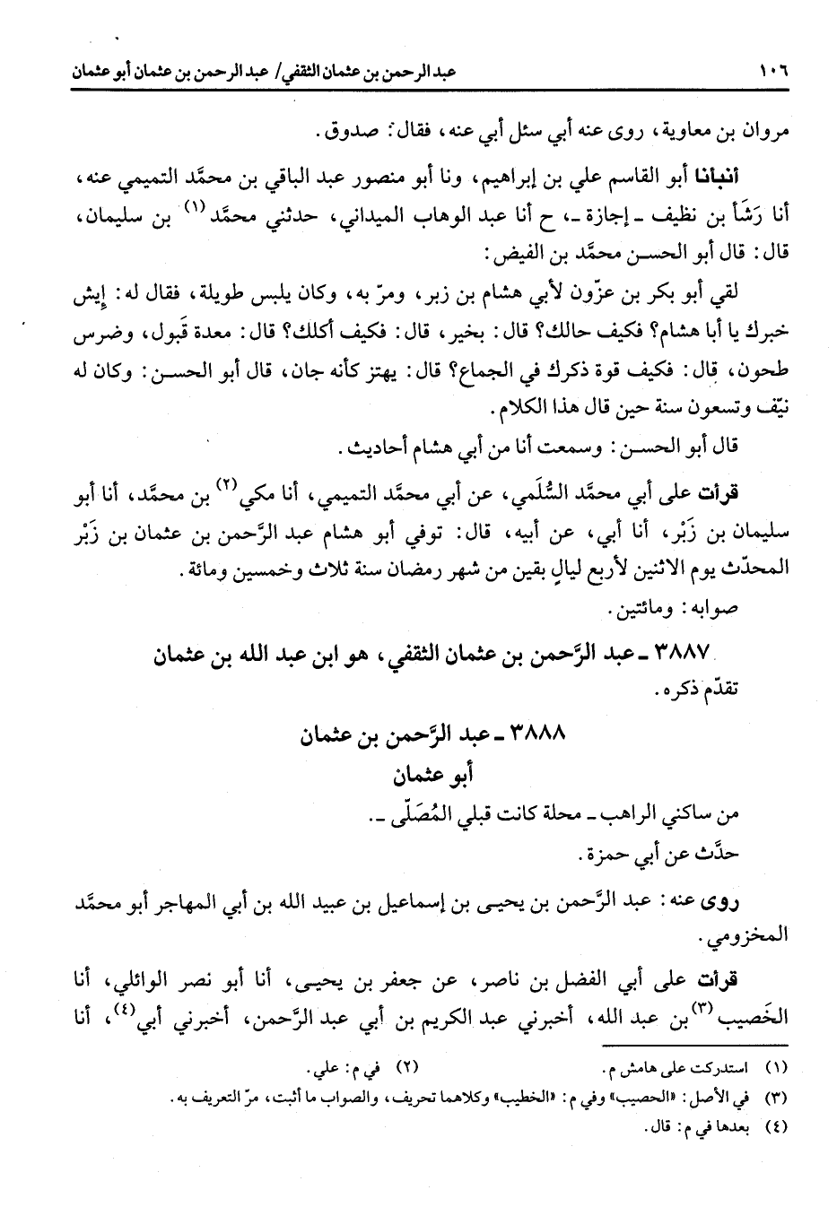 مروان بن معاوية روى عنه ابي سئل أبي عنه فقال صدوق أنبأنا أبو القاسم علي بن ابراهيم ونا أبو منصور عبد الباقي بن محمد التميمي عنه أنا رشأ بن نظيف اجازة ح أنا عبد الوهاب الميداني حدثني محمد (1) بن سليمان قال قال أبو الحسن محمد بن الفيض لقي أبو بكر بن عزون لأبي هشام بن زبر ومر به وكان يلبس طويلة فقال له ايش خبرك يا أبا هشام فكيف حالك قال بخير قال فكيف أكلك قال معدة قبول وضرس طحون قال فكيف قوة ذكرك في الجماع قال يهتز كأنه جان قال أبو الحسن وكان له نيف وتسعون سنة حين قال هذا الكلام قال أبو الحسن وسمعت أنا من أبي هشام أحاديث قرأت على أبي محمد السلمي عن أبي محمد التميمي أنا مكي (2) بن محمد أنا أبو سليمان بن زبر أنا أبي عن أبيه قال توفي أبو هشام عبد الرحمن بن عثمان بن زبر المحدث يوم الإثنين لأربع ليال بقين من شهر رمضان سنة ثلاث وخمسين ومائة صوابه ومائتين 3887 - عبد الرحمن بن عثمان الثقفي هو ابن عبد الله بن عثمان تقدم ذكره 3888 - عبد الرحمن بن عثمان أبو عثمان من ساكني الراهب محلة كانت قبلي المصلى حدث عن أبي حمزة روى عنه عبد الرحمن بن يحيى بن اسماعيل بن عبيد الله بن أبي المهاجر أبو محمد المخزومي قرأت على أبي الفضل بن ناصر عن جعفر بن يحيى أنا أبو نصر الوائلي أنا الخصيب (3) بن عبد الله أخبرني عبد الكريم بن أبي عبد الرحمن أخبرني أبي (4) أنا