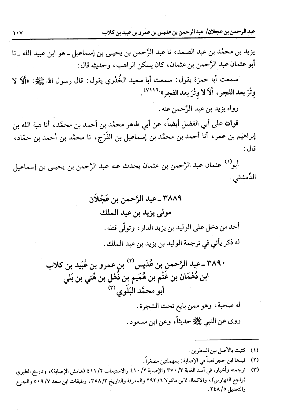 3890 - عبد الرحمن بن عديس (2) بن عمرو بن عبيد بن كلاب ابن دهمان بن غنم بن هميم بن ذهل بن هني بن بلي أبو محمد البلوي (3) له صحبة وهو ممن بايع تحت الشجرة روى عن النبي (صلى الله عليه وسلم) حديثا وعن ابن مسعود