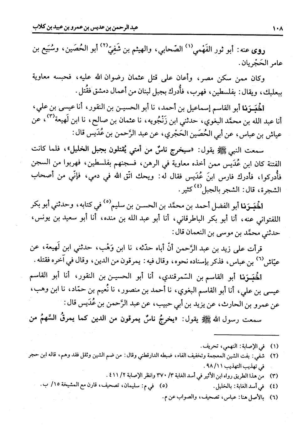 روى عنه أبو ثور (1) الفهمي الصحابي والهيثم بن شفي (2) أبو الحصين وسبيع بن عامر الحجريان وكان ممن سكن مصر وأعان على قتل عثمان رضوان الله عليه فحبسه معاوية ببعلبك ويقال بفلسطين فهرب فأدرك بجبل لبنان من أعمال دمشق فقتل أخبرنا أبو القاسم اسماعيل بن أحمد نا أبو الحسين بن النقور أنا عيسى بن علي أنا عبد الله بن محمد البغوي حدثني ابن زنجوية نا عثمان بن صالح نا ابن لهيعة (3) عن عياش بن عباس عن أبي الحصين الحجري عن عبد الرحمن بن عديس قال سمعت النبي (صلى الله عليه وسلم) يقول سيخرج ناس من أمتي يقتلون بجبل (4) الخليل فلما كانت الفتنة كان ابن عديس ممن أخذه معاوية في الرهن فسجنهم بفلسطين فهربوا من السجن فأدركوا فأدرك فارس ابن عديس فقال له ويحك اتق الله في دمي فاني من أصحاب الشجرة قال الشجر بالجبل كثير أخبرنا أبو الفضل أحمد بن محمد بن الحسن بن سليم (5) في كتابه وحدثني أبو بكر اللفتواني عنه أنا أبو بكر الباطرقاني أنا أبو عبد الله بن منده أنا أبو سعيد بن يونس حدثني محمد بن موسى بن النعمان قال قرأت على زيد بن عبد الرحمن ان أباه حدثه نا ابن وهب حدثني ابن لهيعة عن عياش (6) بن عباس فذكر بإسناده نحوه وقال فيه يمرقون من الدين وقال في آخره فقتله أخبرنا أبو القاسم بن السمرقندي أنا أبو الحسين بن النقور أنا أبو القاسم عيسى بن علي أنا أبو القاسم البغوي نا أحمد بن منصور نا نعيم بن حماد نا ابن وهب عن عمرو بن الحارث عن يزيد بن أبي حبيب عن عبد الرحمن بن عديس قال سمعت رسول الله (صلى الله عليه وسلم) يقول يخرج ناس يمرقون من الدين كما يمرق السهم من