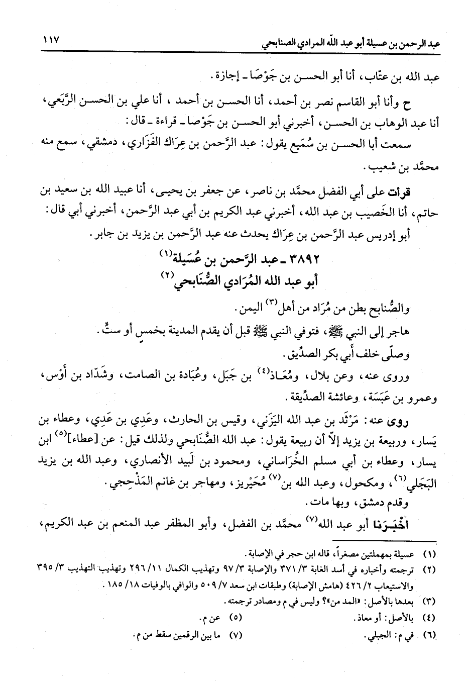 3892 - عبد الرحمن بن عسيلة (2) أبو عبد الله المرادي الصنابحي (2) والصنابح بطن من مراد من أهل (3) اليمن هاجر الى النبي (صلى الله عليه وسلم) فتوفي النبي (صلى الله عليه وسلم) قبل أن يقدم المدينة بخمس أو ست وصلى خلف أبي بكر الصديق وروى عنه وعن بلال ومعاذ (4) بن جبل وعبادة بن الصامت وشداد بن أوس وعمرو بن عبسة وعائشة الصديقة روى عنه مرثد بن عبد الله اليزني وقيس بن الحارث وعدي بن عدي وعطاء بن يسار وربيعة بن يزيد الا ان ربيعة يقول عبد الله الصنابحي ولذلك قيل عن [عطاء] (5) ابن يسار وعطاء بن أبي مسلم الخرساني ومحمود بن لبيد الأنصاري وعبد الله بن يزيد البجلي (6) ومكحول وعبد الله بن (7) محيريز ومهاجر بن غانم المذحجي وقدم دمشق وبها مات أخبرنا أبو عبد الله (7) محمد بن الفضل وأبو المظفر عبد المنعم بن عبد الكريم