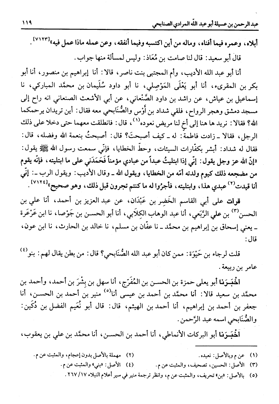 [7124] قرأت على أبي القاسم الخضر بن عبدان عن عبد العزيز بن أحمد أنا علي بن الحسن (3) بن علي الربعي أنا عبد الوهاب الكلابي أنا أبو الحسن بن جوصا نا ابن عرعرة يعني اسحاق بن إبراهيم بن محمد نا عفان بن مسلم نا خالد بن الحارث نا ابن عون قال قلت لرجاء بن حيوة ممن كان أبو عبد الله الصنابحي قال من بطن يقال لهم بنو (4) عامر بن ربيعة أخبرنا أبو يعلى حمزة بن الحسن بن المفرج أنا سهل بن بشر بن أحمد وأحمد بن محمد بن سعيد قالا أنا محمد بن أحمد بن عيسى أنا (5) منير بن أحمد بن الحسن أنا جعفر بن أحمد بن ابراهيم أنا أحمد بن الهيثم قال قال أبو نعيم الفضل بن دكين والصنابحي اسمه عبد الرحمن أخبرنا أبو البركات الأنماطي أنا أحمد بن الحسن أنا محمد بن علي بن يعقوب