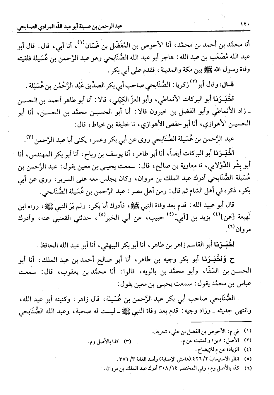 أنا محمد بن أحمد بن محمد أنا الأحوص بن المفضل بن غسان (1) أنا أبي قال قال أبو عبد الله مصعب بن عبد الله هاجر أبو عبد الله الصنابحي وهو عبد الرحمن بن عسيلة فلقيته وفاة رسول الله (صلى الله عليه وسلم) بين مكة والمدينة فقدم على أبي بكر قال وقال أبو (2) زكريا الصنابحي صاحب أبي بكر الصديق عبد الرحمن بن عسيلة أخبرنا أبو البركات الأنماطي وأبو العز الكيلي قالا أنا أبو طاهر أحمد بن الحسن زاد الأنماطي وأبو الفضل بن خيرون قالا أنا أبو الحسين محمد بن الحسن أنا أبو الحسين الأهوازي أنا أبو حفص الأهوازي نا خليفة بن خياط قال عبد الرحمن بن عسيلة الصنابحي روى عن أبي بكر وعمر يكنى أبا عبد الرحمن (3) أخبرنا أبو البركات ايضا أنا أبو طاهر أنا يوسف بن رباح أنا أبو بكر المهندس أنا أبو بشر الدولابي نا معاوية بن صالح قال سمعت يحيى بن معين يقول عبد الرحمن بن عسيلة الصنابحي أدرك عبد الملك بن مروان وكان يجلس معه على السرير روى عن أبي بكر ذكره في أهل الشام ثم قال ومن أهل مصر عبد الرحمن بن عسيلة الصنابحي قال أبو عبيد الله قدم بعد وفاة النبي (صلى الله عليه وسلم) فأدرك أبو بكر ولم ير النبي (صلى الله عليه وسلم) رواه ابن لهيعة [عن] (4) يزيد بن [أبي] (4) حبيب عن أبي الخير (5) حدثني القعنبي عنه وأدرك مروان (6) أخبرنا أبو القاسم زاهر بن طاهر أنا أبو بكر البيهقي أنا أبو عبد الله الحافظ ح وأخبرنا أبو بكر وجيه بن طاهر أنا أبو صالح احمد بن عبد الملك أنا أبو الحسن بن السقا وأبو محمد بن بالويه قالوا أنا محمد بن يعقوب قال سمعت عباس بن محمد يقول سمعت يحيى بن معين يقول الصنابحي صاحب أبي بكر عبد الرحمن بن عسيلة قال زاهر وكنيته أبو عبد الله وانتهى حديثه وزاد وجيه قدم بعد وفاة النبي (صلى الله عليه وسلم) ليست له صحبة وعبد الله الصنابحي