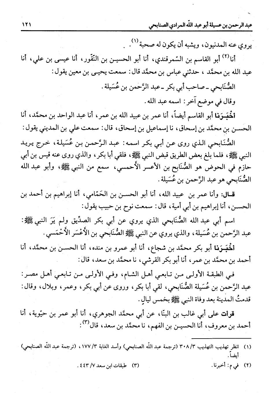 (1) انظر تهذيب التهذيب 3 / 308 (ترجمة عبد الله الصنابحي) وأسد الغابة 3 / 177، (ترجمة عبد الله الصنابحي) أيضا