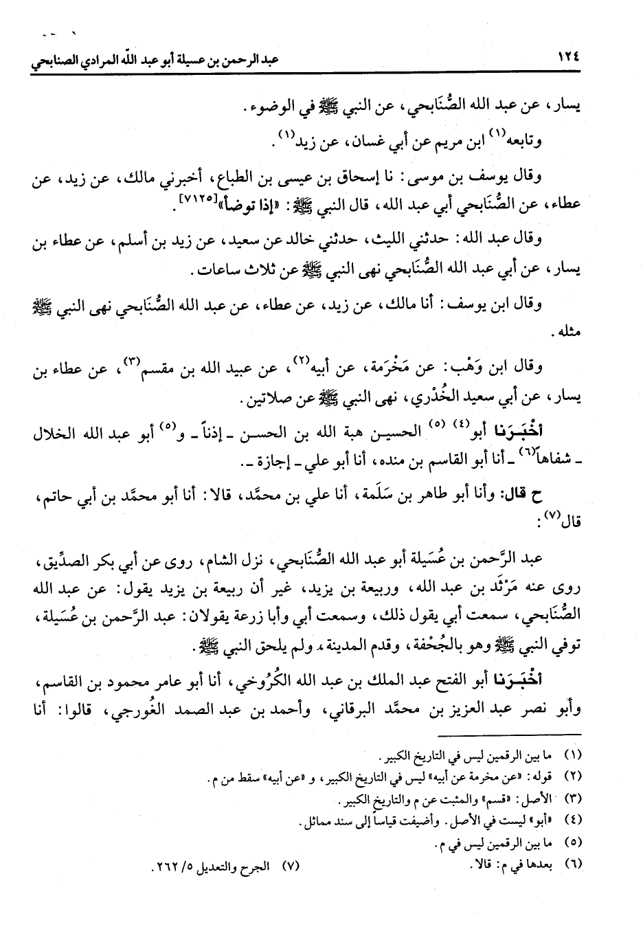 [7125] وقال عبد الله حدثني الليث حدثني خالد عن سعيد عن زيد بن أسلم عن عطاء بن يسار عن أبي عبد الله الصنابحي نهى النبي (صلى الله عليه وسلم) عن ثلاث ساعات وقال ابن يوسف أنا مالك عن زيد عن عطاء عن عبد الله الصنابحي نهى النبي (صلى الله عليه وسلم) مثله وقال ابن وهب عن مخرمة عن أبيه (2) عن عبيد الله بن مقسم (3) عن عطاء بن يسار عن أبي سعيد الخدري نهى النبي (صلى الله عليه وسلم) عن صلاتين أخبرنا أبو (4) (5) الحسين هبة الله بن الحسن اذنا و (5) أبو عبد الله الخلال شفاها (6) أنا أبو القاسم بن منده أنا أبو علي اجازة ح قال وأنا أبو طاهر بن سلمة أنا علي بن محمد قالا أنا أبو محمد بن أبي حاتم قال (7) عبد الرحمن بن عسيلة أبو عبد الله الصنابحي نزل الشام روى عن أبي بكر الصديق روى عنه مرثد بن عبد الله وربيعة بن يزيد غير ان ربيعة بن يزيد يقول عن عبد الله الصنابحي سمعت أبي يقول ذلك وسمعت أبي وأبا زرعة يقولان عبد الرحمن بن عسيلة توفي النبي (صلى الله عليه وسلم) وهو بالجحفة وقدم المدينة ولم يلحق النبي (صلى الله عليه وسلم) أخبرنا أبو الفتح عبد الملك بن عبد الله الكروخي أنا أبو عامر محمود بن القاسم وأبو نصر عبد العزيز بن محمد البرقاني وأحمد بن عبد الصمد الغورجي قالوا أنا