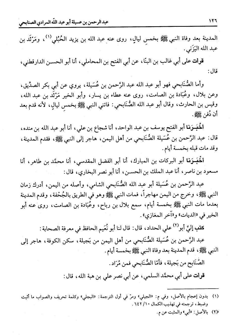 المدينة بعد وفاة النبي (صلى الله عليه وسلم) بخمس ليال روى عنه عبد الله بن يزيد الحلبي (1) ومرثد بن عبد الله اليزني قرأت على أبي غالب بن البنا عن أبي الفتح بن المحاملي أنا أبو الحسن الدارقطني قال وأما الصنابحي فهو أبو عبد الله عبد الرحمن بن عسيلة يروي عن أبي بكر الصديق وعن بلال وعبادة بن الصامت روى عنه عطاء بن يسار وأبو الخير مرثد بن عبد الله وقيس بن الحارث وقال أبو عبد الله الصنابحي فاتني النبي (صلى الله عليه وسلم) بخمس ليال لأنه قدم بعد ان دفن (صلى الله عليه وسلم) أخبرنا أبو الفتح يوسف بن عبد الواحد أنا شجاع بن علي أنا أبو عبد الله بن منده قال عبد الرحمن بن عسيلة الصنابحي من أهل اليمن هاجر الى النبي (صلى الله عليه وسلم) فقدم المدينة وقد مات قبله بخمسة أيام أخبرنا أبو البركات بن المبارك أنا أبو الفضل المقدسي أنا محمد بن طاهر أنا مسعود بن ناصر أنا عبد الملك بن الحسن أنا أبو نصر البخاري قال عبد الرحمن بن عسيلة أبو عبد الله الصنابحي الشامي وأصله من اليمن أدرك زمان النبي (صلى الله عليه وسلم) وخرج من اليمن مهاجرا فمات النبي (صلى الله عليه وسلم) وهو في الطريق بالجحفة وقدم المدينة بعدما مات النبي (صلى الله عليه وسلم) بخمسة أيام سمع بلال بن رباح وعبادة بن الصامت روى عنه أبو الخير في الديات وآخر المغازي كتب الي أبو (2) على الحداد قال قال لنا أبو نعيم الحافظ في معرفة الصحابة عبد الرحمن بن عسيلة الصنابحي من أهل اليمن من بجيلة سكن الكوفة هاجر الى النبي (صلى الله عليه وسلم) قدم المدينة بعد وفاة النبي (صلى الله عليه وسلم) بخمسة أيام الصنابح من بجيلة فأما الصنابحي فمن مراد قرأت على أبي محمد السلمي عن أبي نصر علي بن هبة الله قال