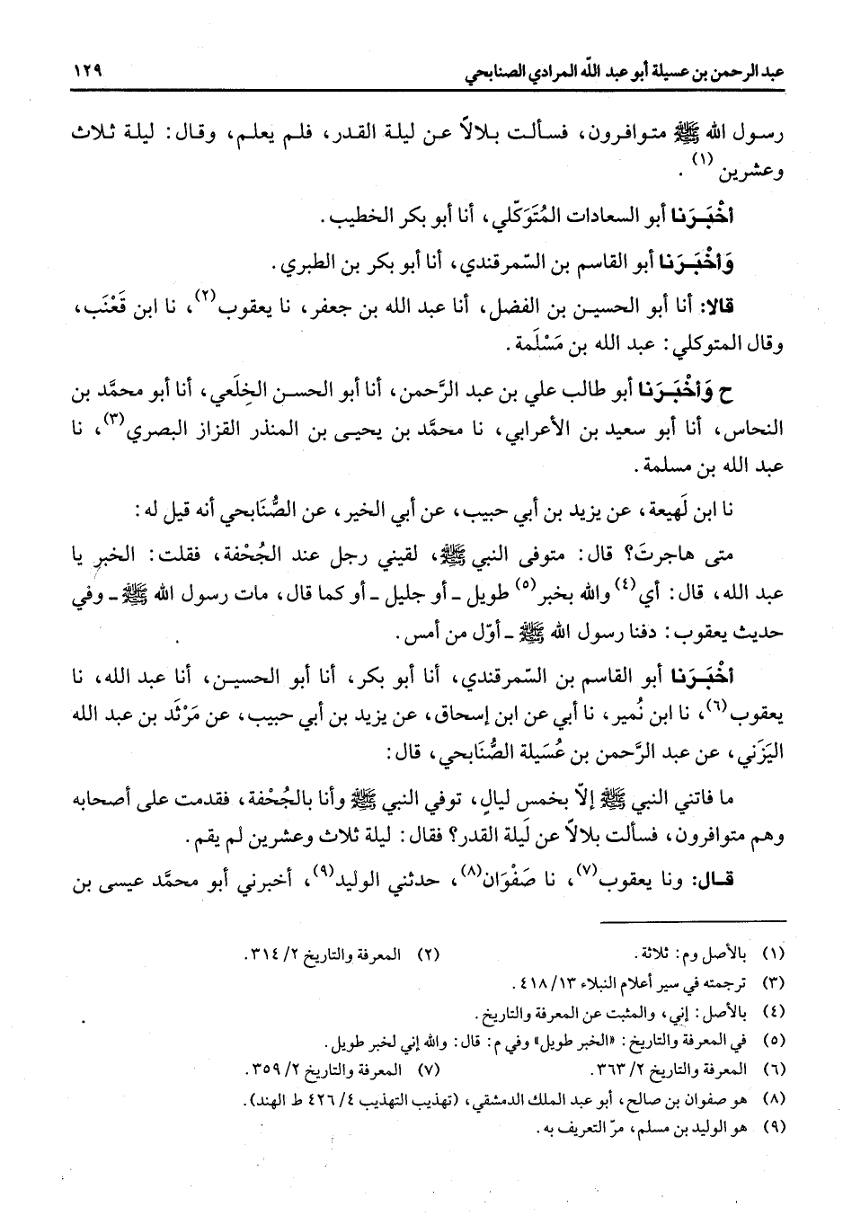 رسول الله (صلى الله عليه وسلم) متوافرون فسألت بلالا عن ليلة القدر فلم يعلم وقال ليلة ثلاث وعشرين (1) أخبرنا أبو السعادات المتوكلي أنا أبو بكر الخطيب وأخبرنا أبو القاسم بن السمرقندي أنا أبو بكر بن الطبري قالا أنا أبو الحسين بن الفضل أنا عبد الله بن جعفر نا يعقوب (2) نا ابن قعنب وقال المتوكلي عبد الله بن مسلمة ح وأخبرنا أبو طالب علي بن عبد الرحمن أنا أبو الحسن الخلعي أنا أبو محمد بن النحاس أنا أبو سعيد بن الأعرابي نا محمد بن يحيى بن المنذر القزاز البصري (3) نا عبد الله بن مسلمة نا ابن لهيعة عن يزيد بن أبي حبيب عن أبي الخير عن الصنابحي انه قيل له متى هاجرت قال متوفي النبي (صلى الله عليه وسلم) لقيني رجل عند الجحفة فقلت الخبر يا عبد الله قال أي (4) والله بخبر (5) طويل أو جليل أو كما قال مات رسول الله (صلى الله عليه وسلم) وفي حديث يعقوب دفنا رسول الله (صلى الله عليه وسلم) اول من أمس أخبرنا أبو القاسم بن السمرقندي أنا أبو بكر أنا أبو الحسين أنا عبد الله نا يعقوب (6) نا ابن نمير نا أبي عن ابن اسحاق عن يزيد بن أبي حبيب عن مرثد بن عبد الله اليزني عن عبد الرحمن بن عسيلة الصنابحي قال ما فاتني النبي (صلى الله عليه وسلم) الا بخمس ليال توفي النبي (صلى الله عليه وسلم) وأنا بالجحفة فقدمت على أصحابه وهم متوافرون فسألت بلالا عن ليلة القدر فقال ليلة ثلاث وعشرين لم يقم قال ونا يعقوب (7) نا صفوان (8) حدثني الوليد (9) أخبرني أبو محمد عيسى بن